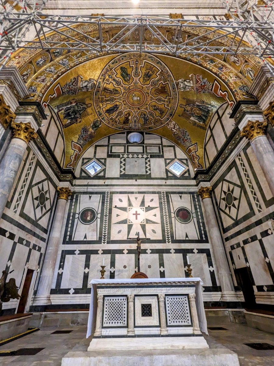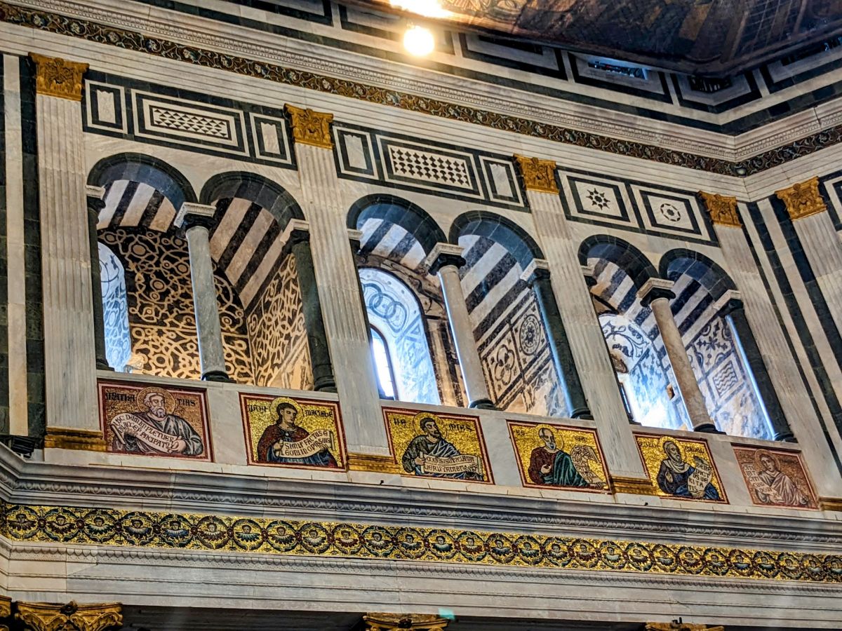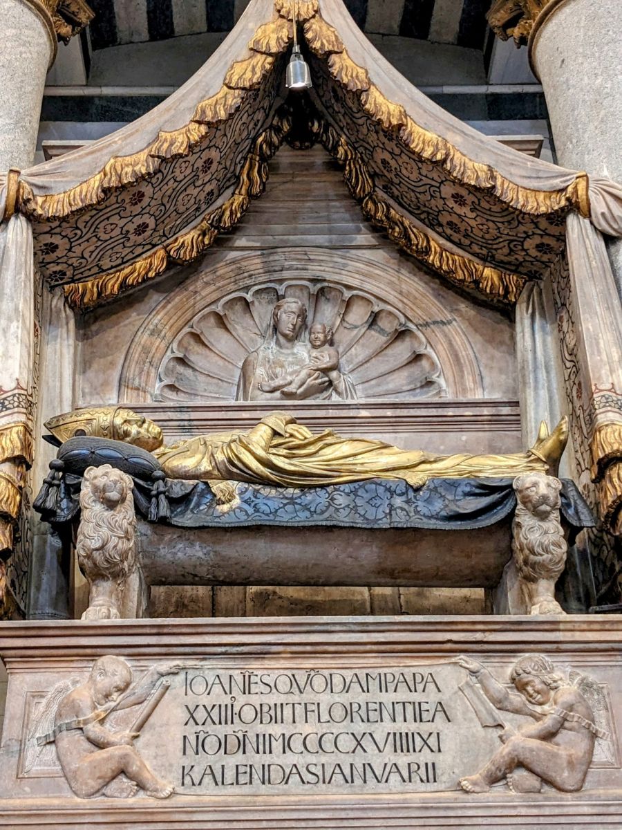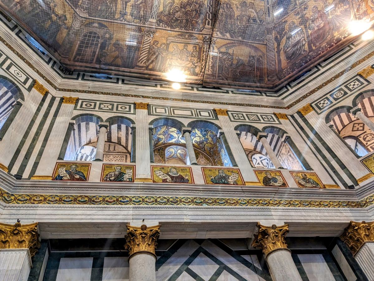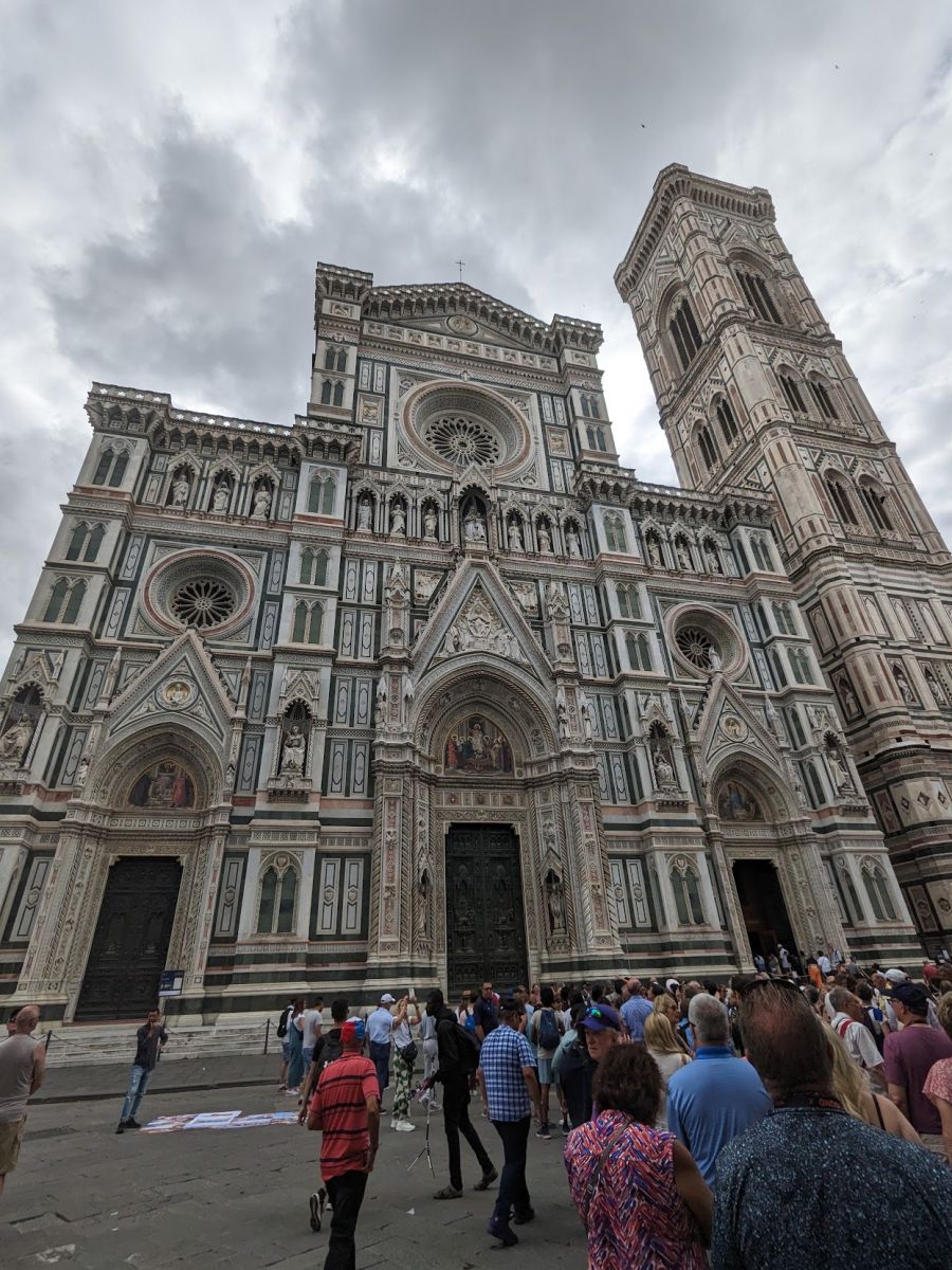 After our mid-morning snack, we headed to the Baptistery of St. John, which is in the Piazza del Duomo. The ceiling was undergoing restoration, but it was still very much worth a visit. It’s one of the oldest buildings in the city, built between 1059 and 1128. Up until 1935, all Florentines were baptized there, including Dante Alighieri, Amerigo Vespucci, and members of the Medici family. The architecture, both inside and out, is extraordinary, taking inspiration from the Roman Pantheon and adding many unique touches. The artwork and sculptures are not to be missed, and there are several sarcophagi and other tombs inside, including the Tomb of Antipope John XXIII. The exterior doors are also great works of art. The south doors present 20 scenes of John the Baptist, the patron saint of Florence. The north doors, designed by Ghiberti, depicts the life of Christ in 20 panels. The east doors, also by Ghiberti, depict stories from the Old Testament beginning with the Creation of Adam and Eve and end with the meeting of King Solomon and the Queen of Sheba. The east doors have become known as the “Gates of Paradise” after Michelangelo said they were so beautiful that “they might fittingly stand at the gates of Paradise.”