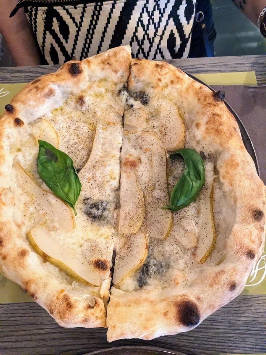 After cocktails, we headed to Fermento 1889 – the pizza place our bartender recommended. It was delicious! They do a 48 hour fermentation (24 cold, 24 room temp), resulting in a pillowy soft crust. Their ingredient combos were great, too. Traditional Margherita, to more adventurous. I had one with fior di latte mozzarella, pear, spicy gorgonzola, pepper, basil, and olive oil.
