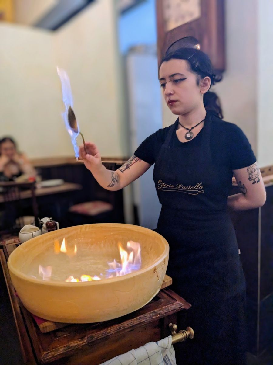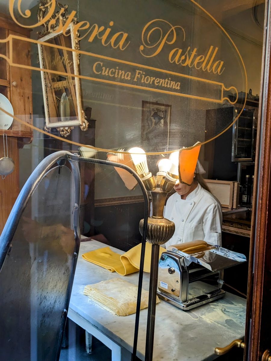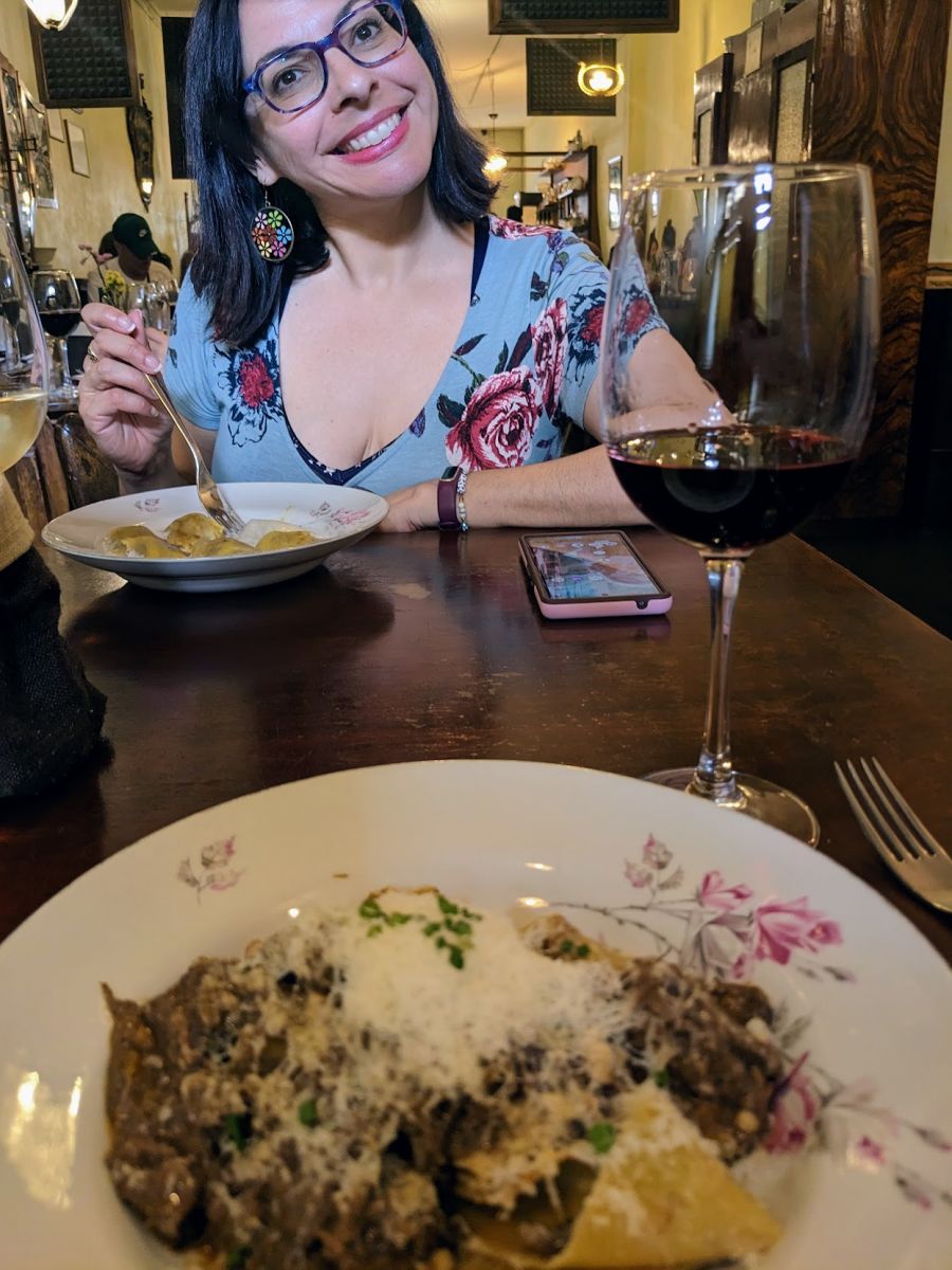 Lunch was at the very popular Osteria Pastella. They do pasta made in a cheese wheel, but we didn’t order it. Luckily, several tables around us did, so we got to see the show they put on when serving it. They gave us a small complimentary Prosecco to start us off. I had wild boar pappardelle, and Teresa had a ravioli dish. The house wine was delicious, so we bought 2 bottles to bring home. (Anyone taking bets on if they last that long?)