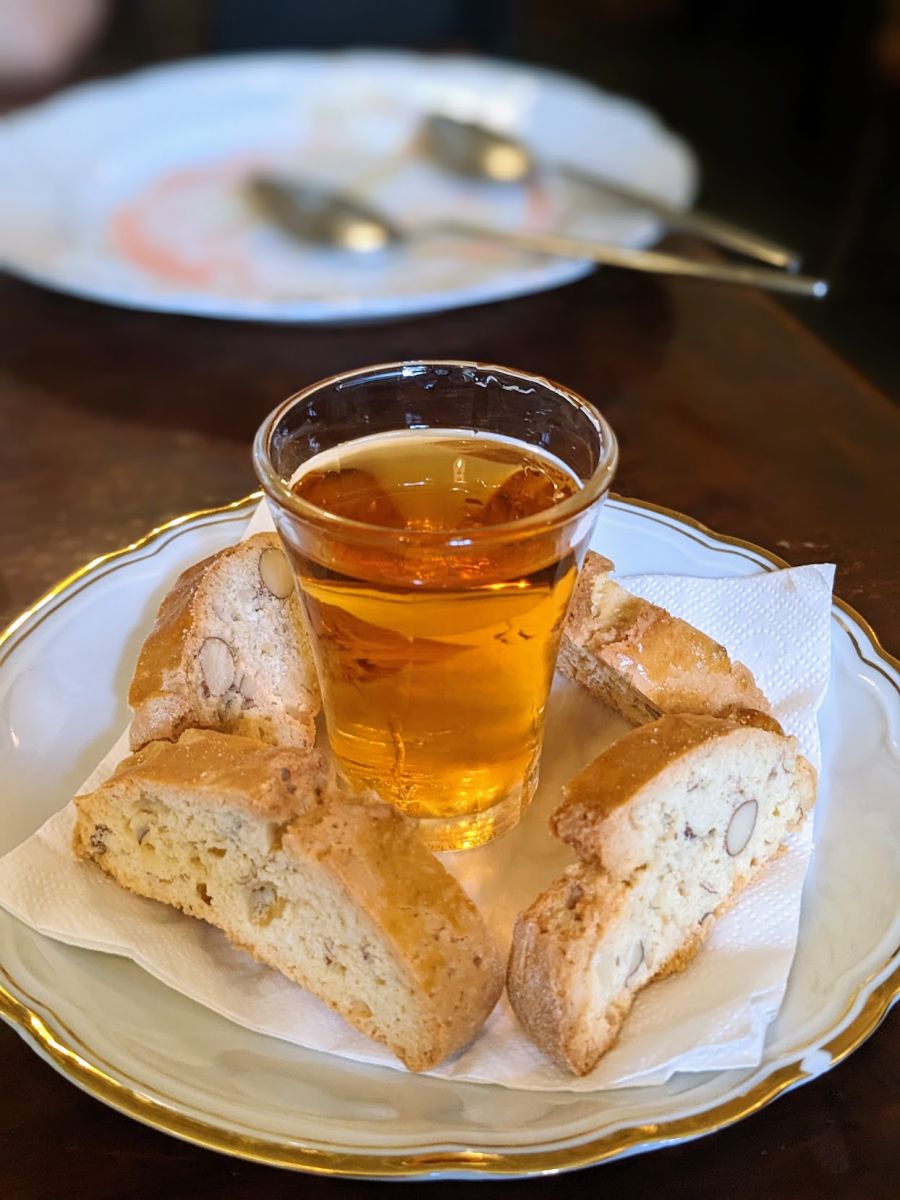 For dessert we had a “dessert lasagne” and Vin Santo with biscotti. They gave us a complimentary limoncello to end the meal.