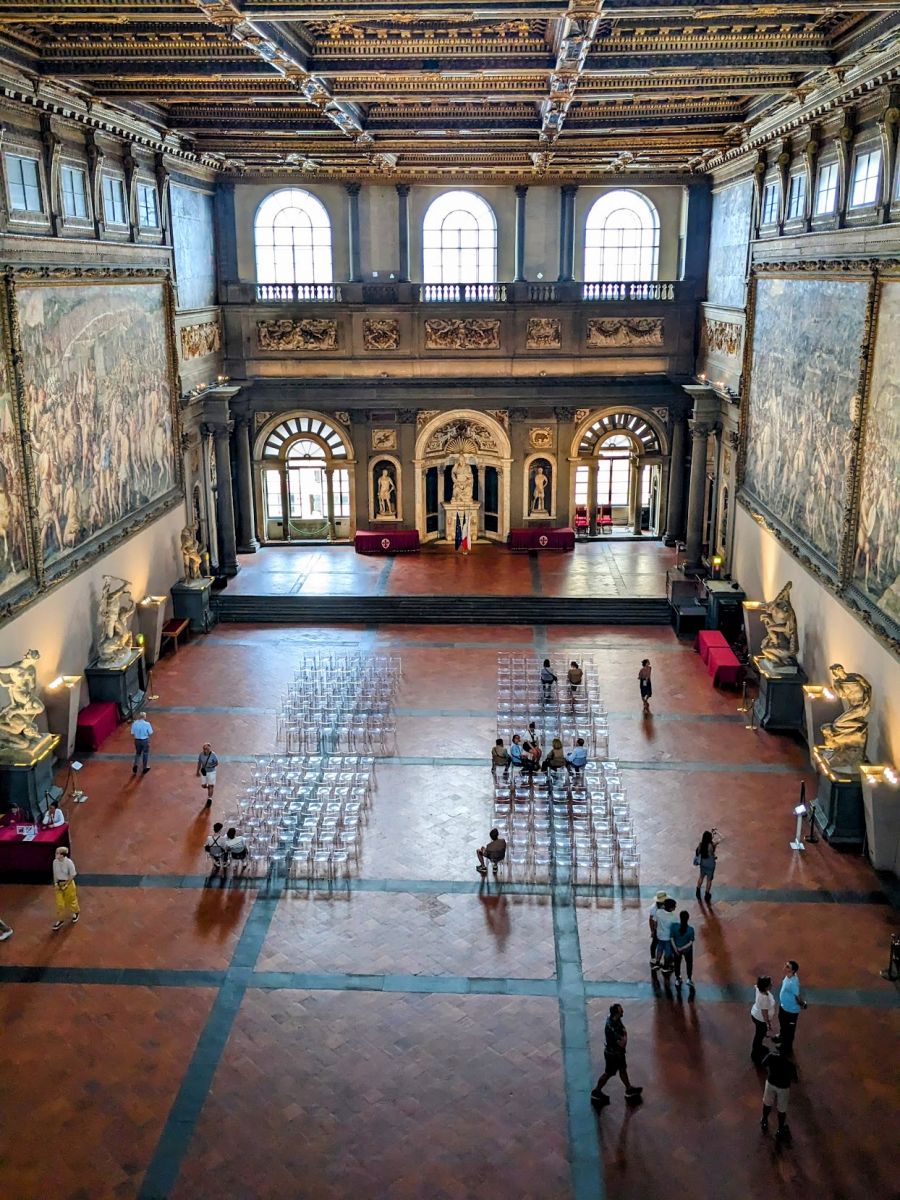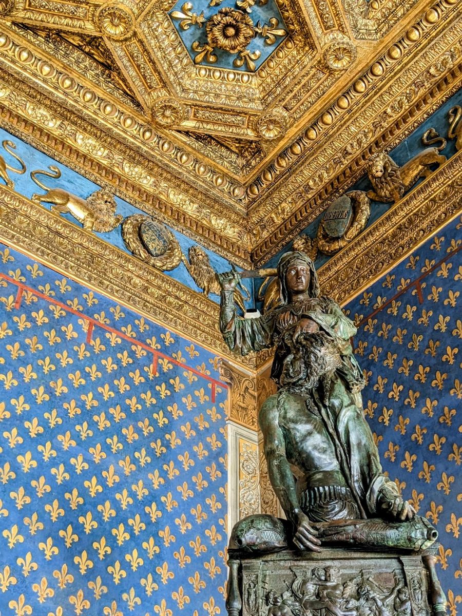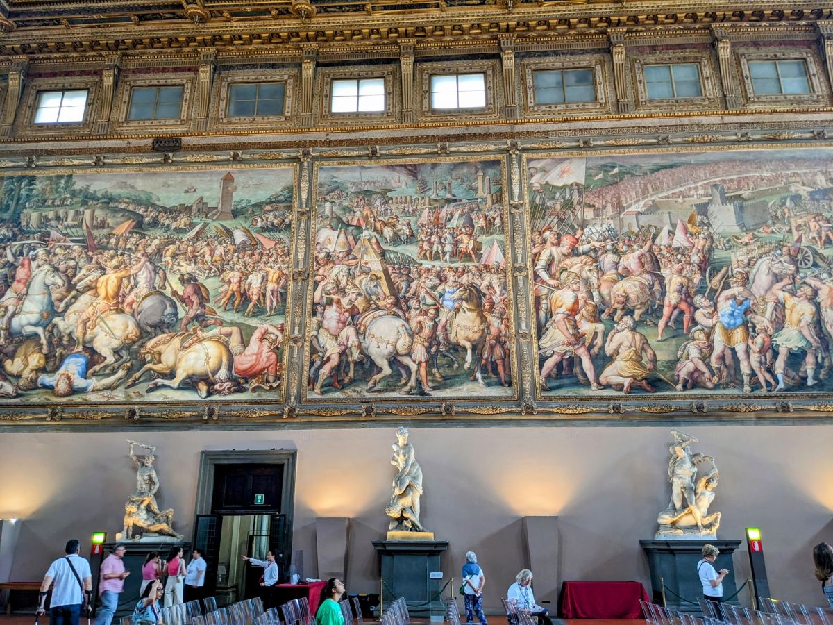 After the Baptistery, we visited the Palazzo Vecchio, which was stunning. The “Old Palace” is the town hall of Florence. It’s been known by several other names over the years: Palazzo del Poppolo, Palazzo dei Priori, Palazzo Ducale, and, originally, Palazzo della Signoria. The palace took its current name when the Medici Duke moved his residence to Palazzo Pitti.