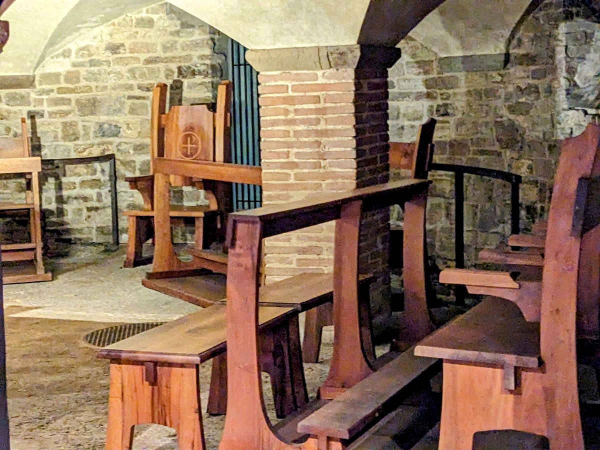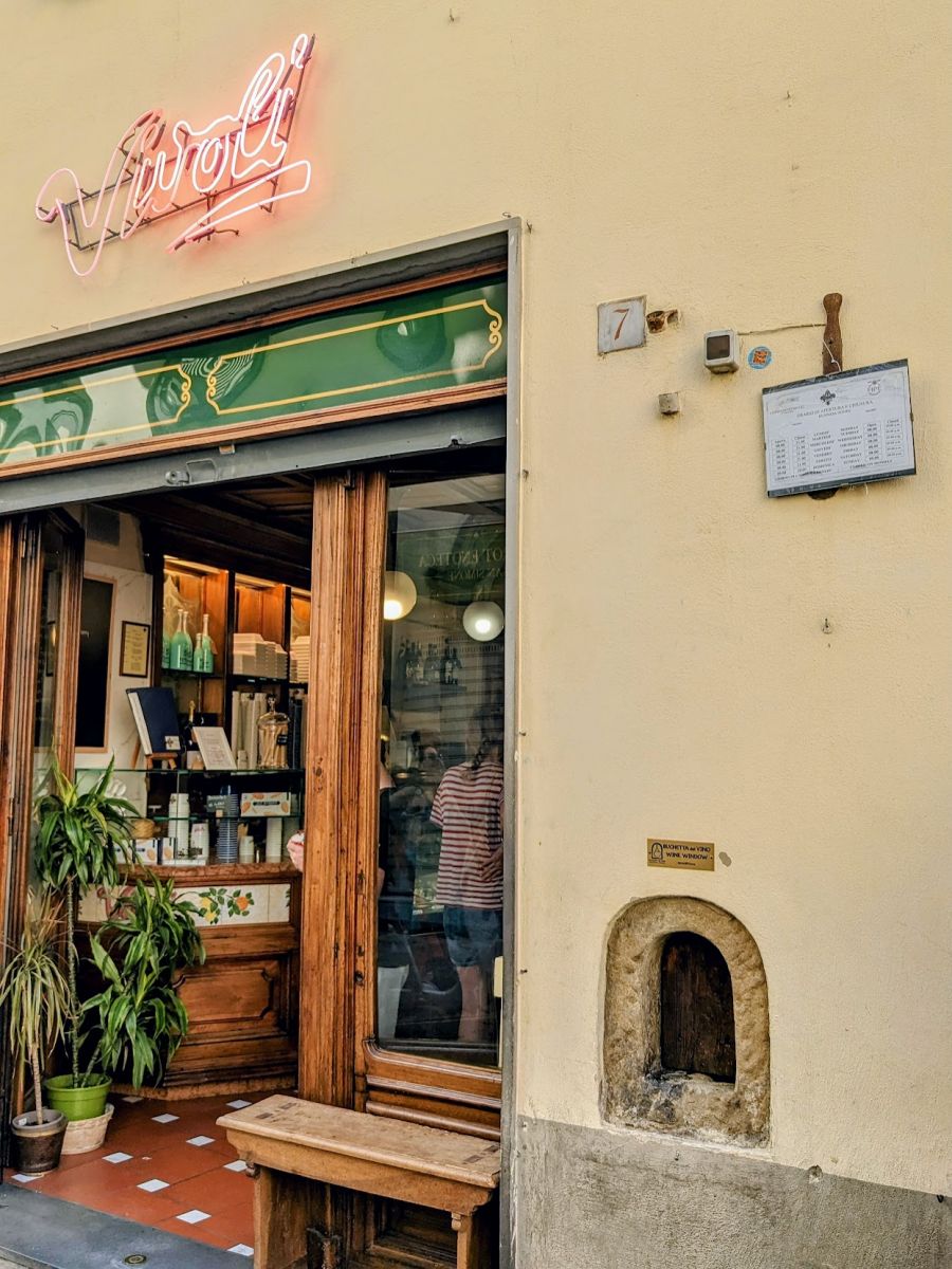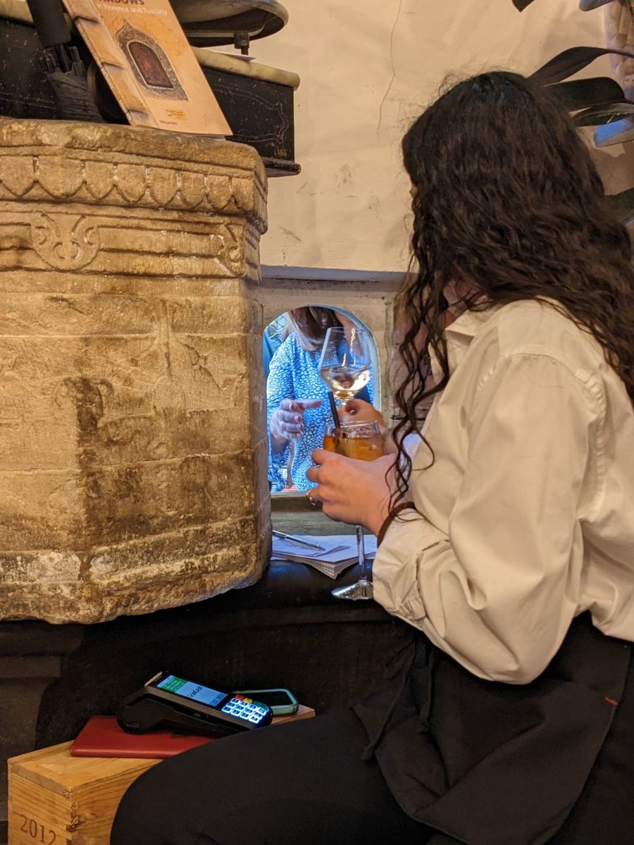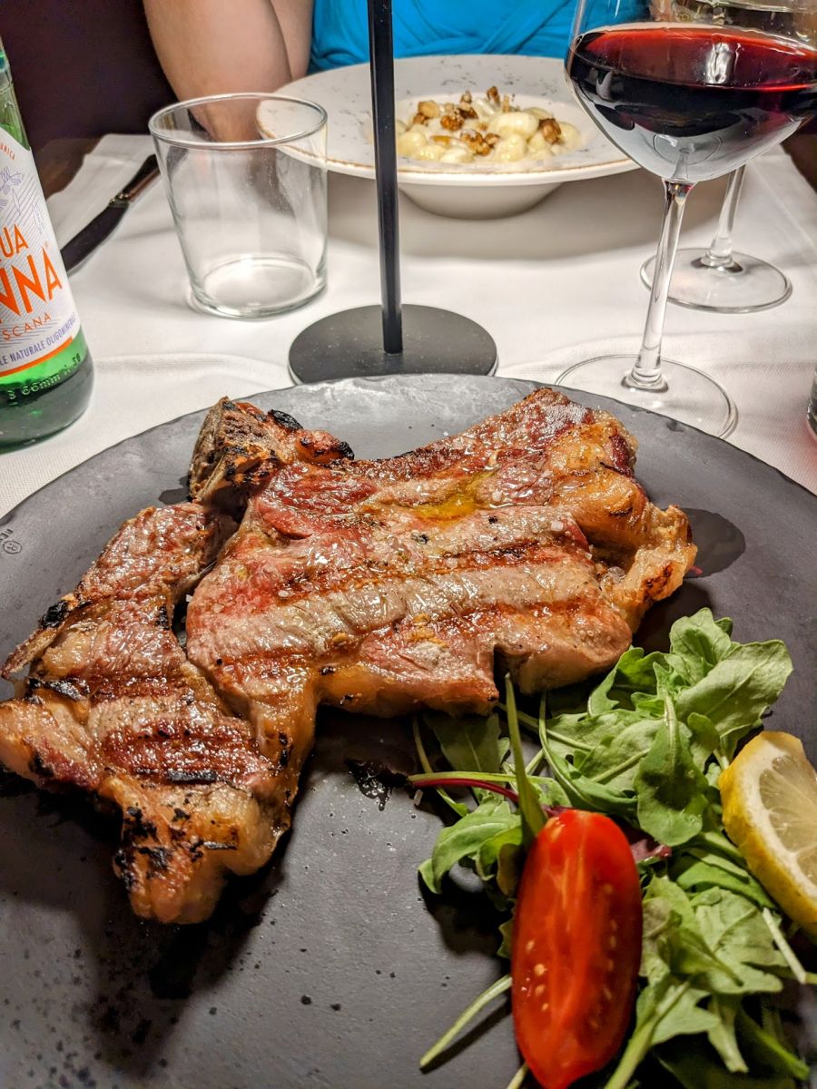 At Osteria Belle Donne, we were able to see the same wine window we saw previously, but this time from the other side! Dinner was excellent. We shared a burrata appetizer, then I had the bistecca alla fiorentina (the famous steak made from Chianina cattle), and Teresa had gnocchi with pears.
