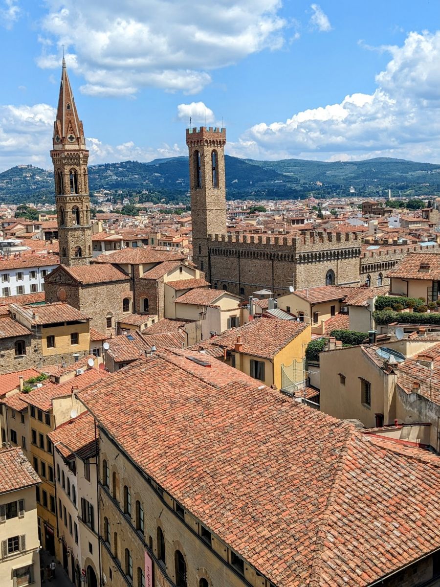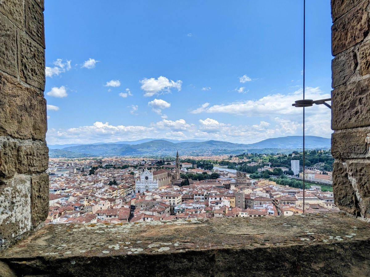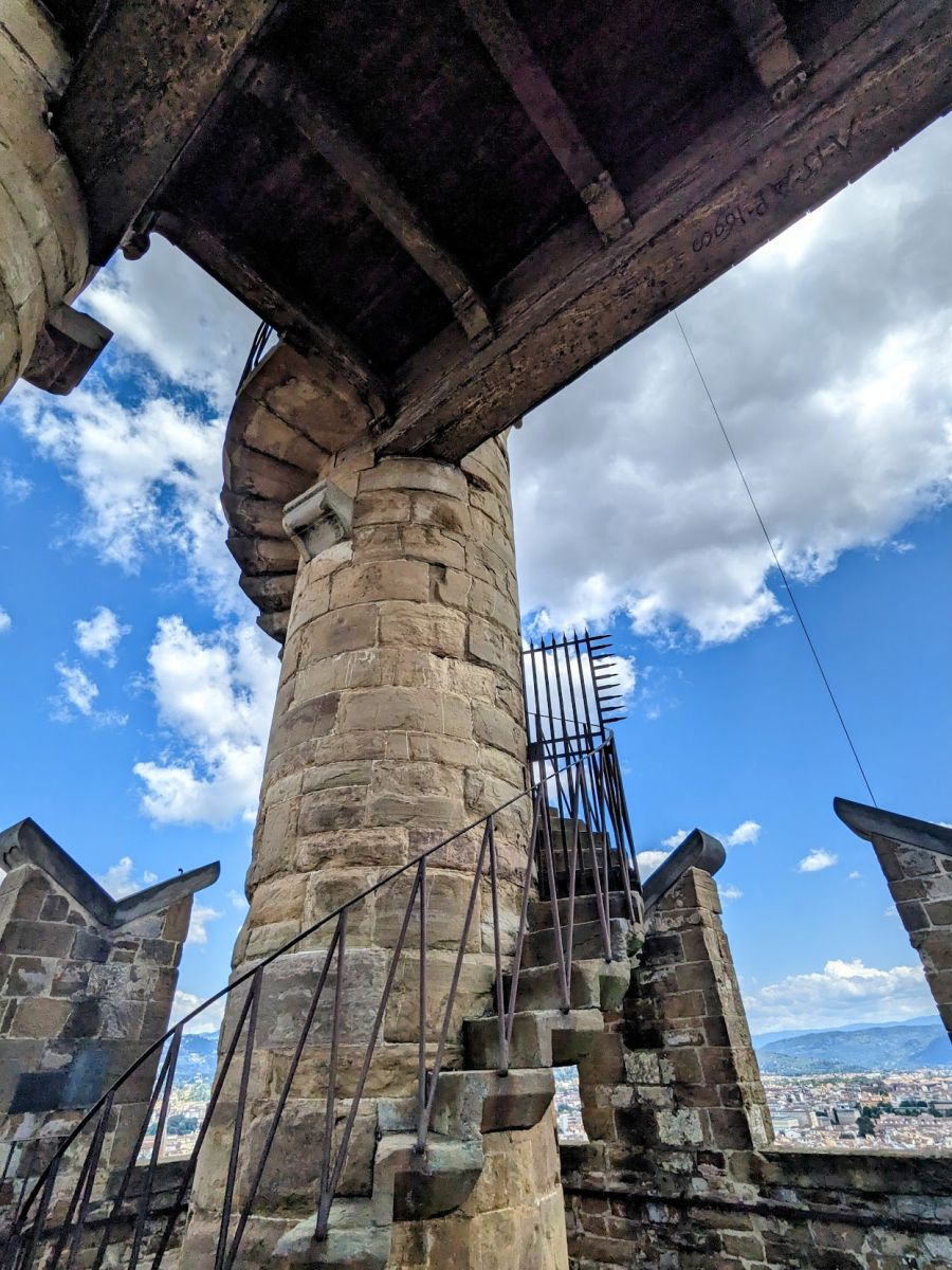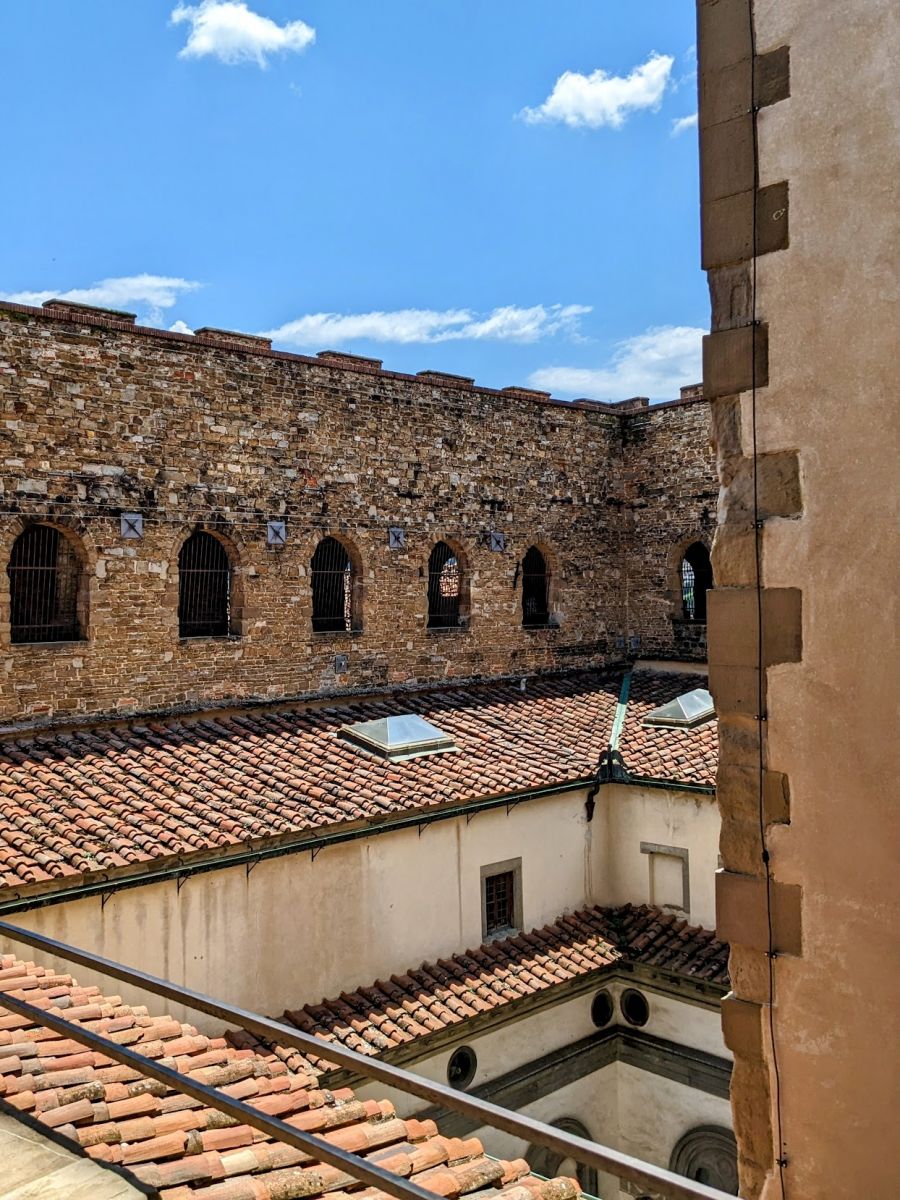 After a lunch of porchetta and salad, we headed back to Palazzo Vecchio so I could climb the tower. The tower takes its name from the architect Arnolfo di Cambio, and was built at the beginning of the 14th century. It’s a fairly easy climb, but if you don’t want to go all the way to the top, there’s a nice viewing area on the roof of the Palazzo, before you ascent the tower. There’s a small prison cell built into the tower where Cosimo de’ Medici was imprisoned before his exile.