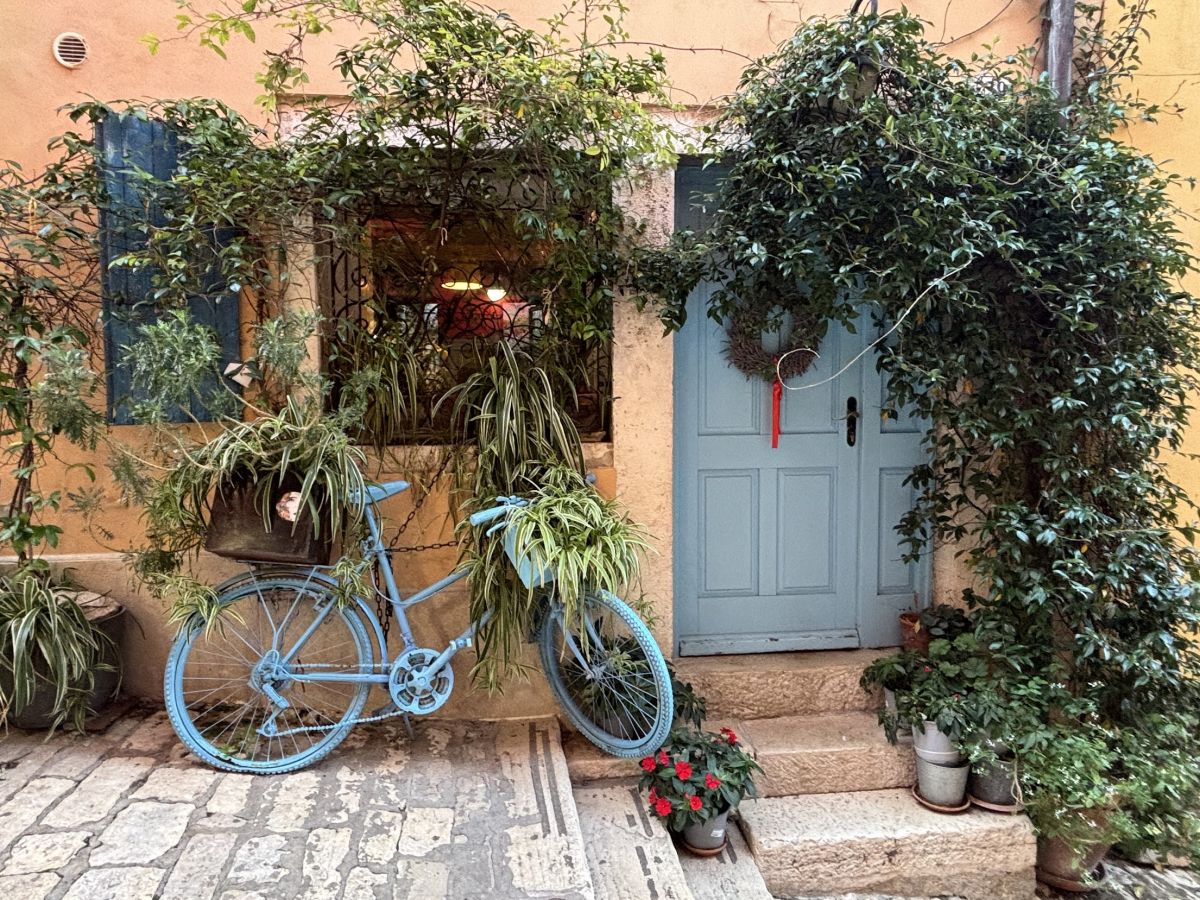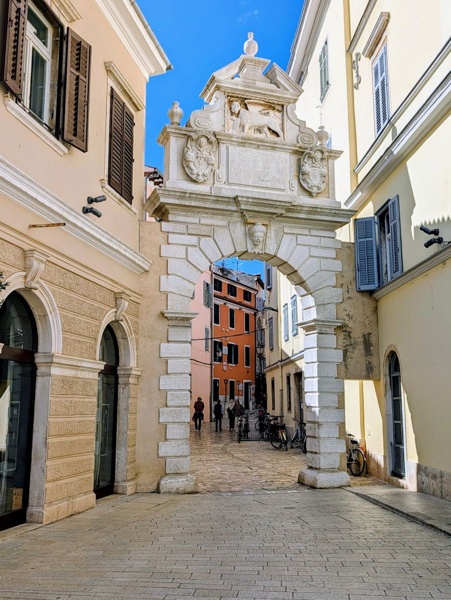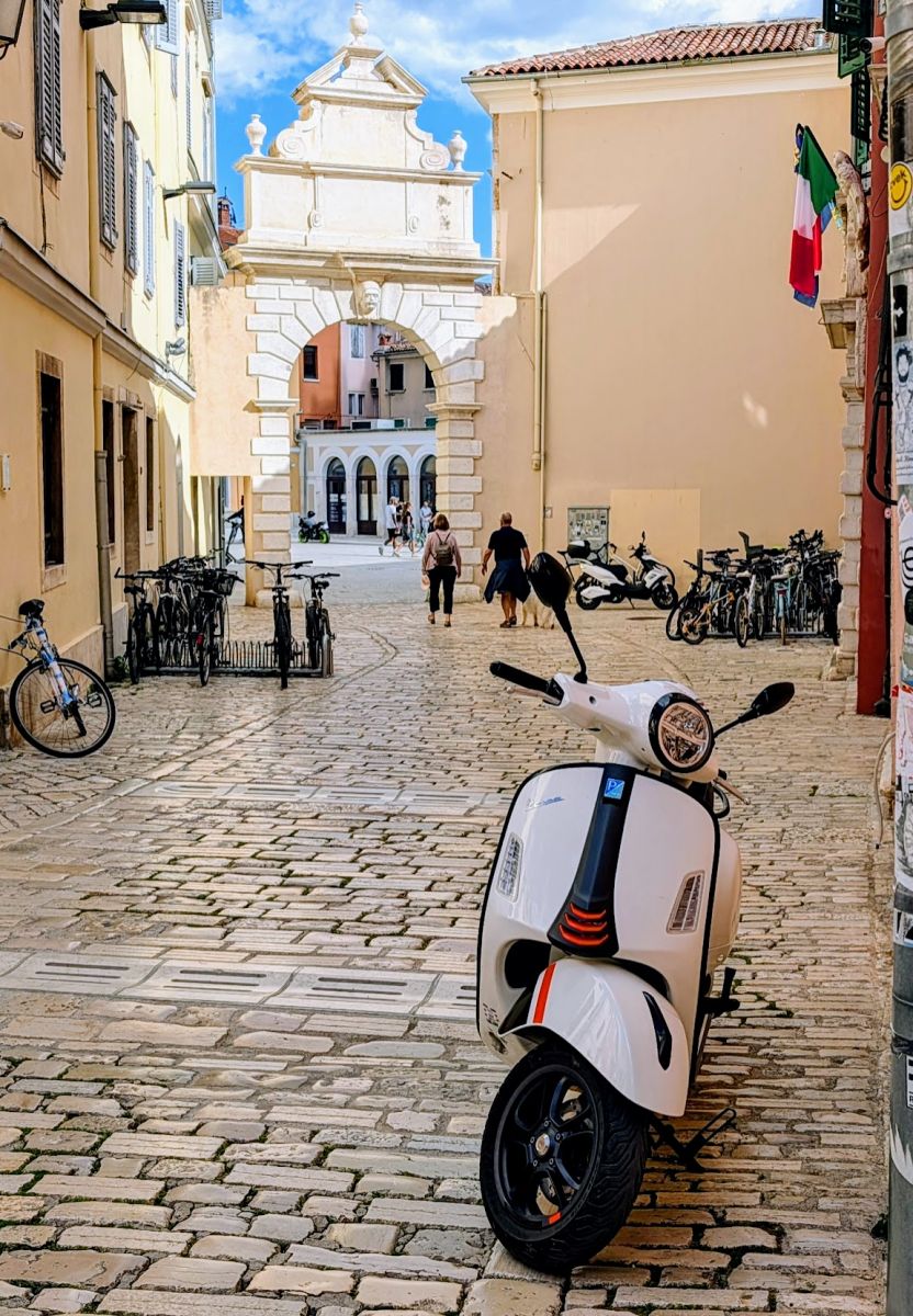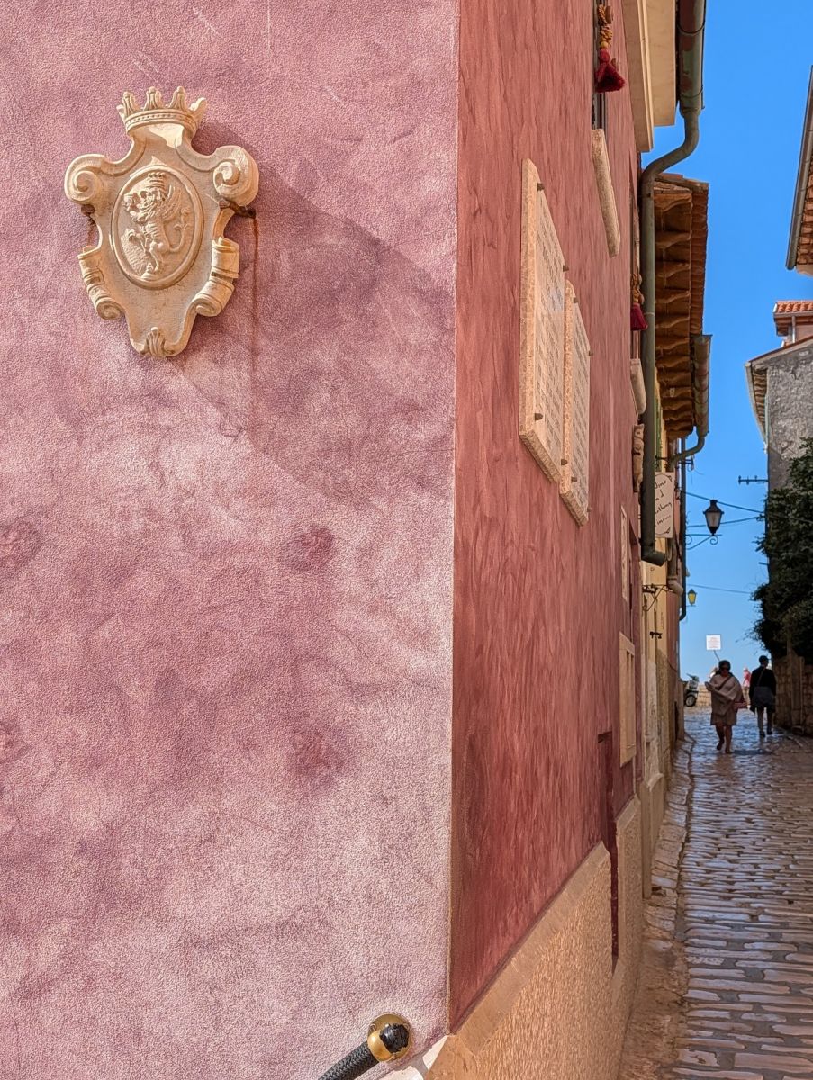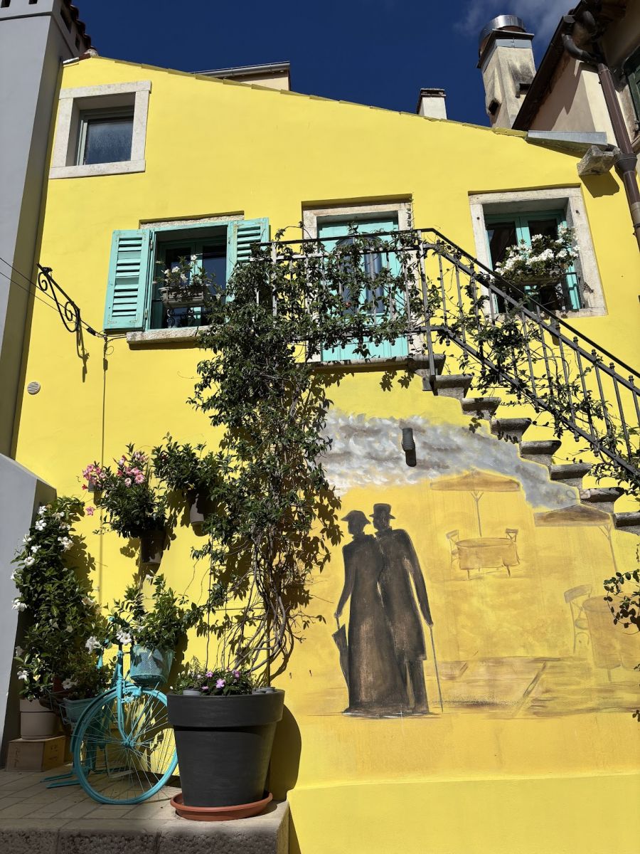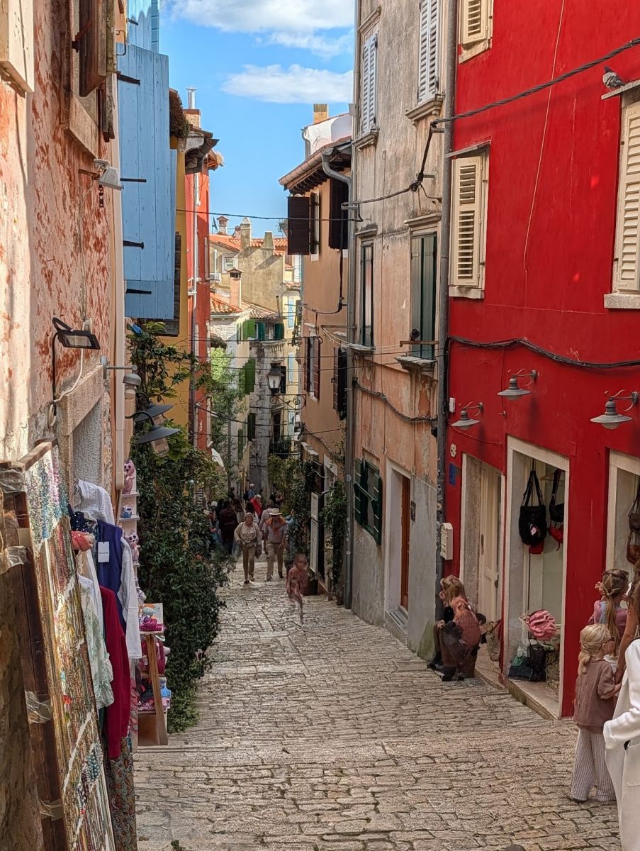 Up early, we walked to Accademia Bridge (Ponte dell’Accademia) for some early morning photos, then to Bar all’Angelo for pistacchio pastries and cappuccini. We took a water bus (vaporetto) to a stop across from the train station, where we’d meet Ella and Dražen. The Mercedes van fit all of us, plus our luggage, no problem. The drive to Rovinj was about three hours, with a brief stop at a place similar to an Autogrill (don’t recall the name) for a snack and bathroom break. We drove through Slovenia, but we didn’t stop, so I don’t count it as a country visited, even though technically we were in-country for a bit and got to enjoy the coastal views.