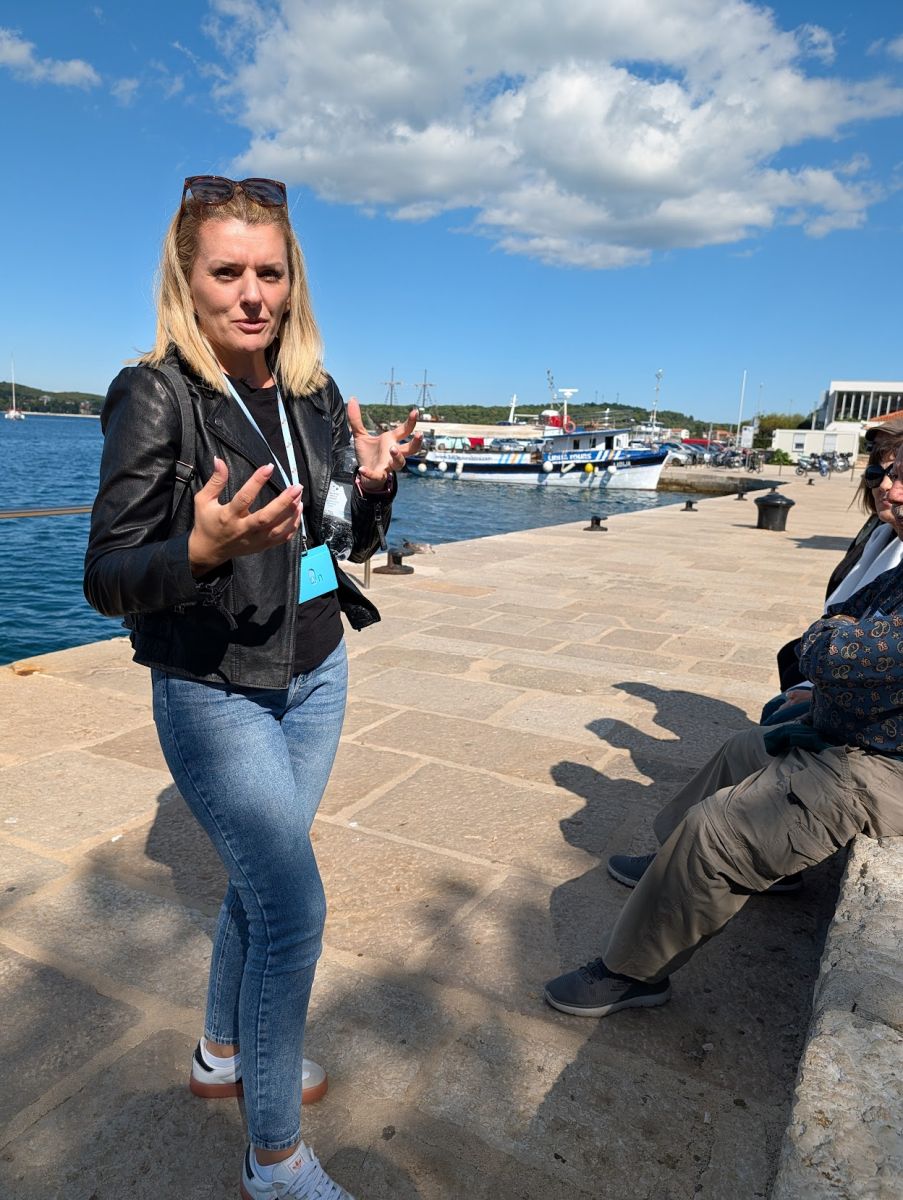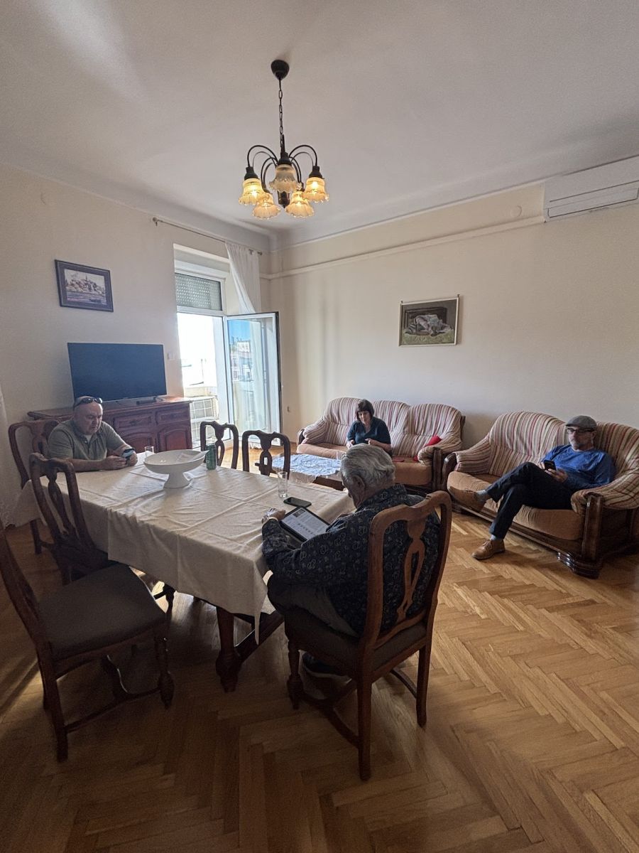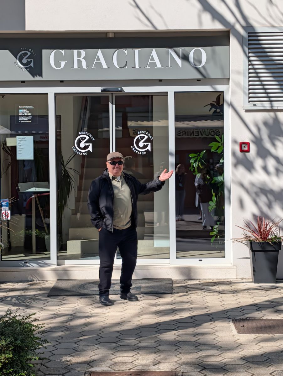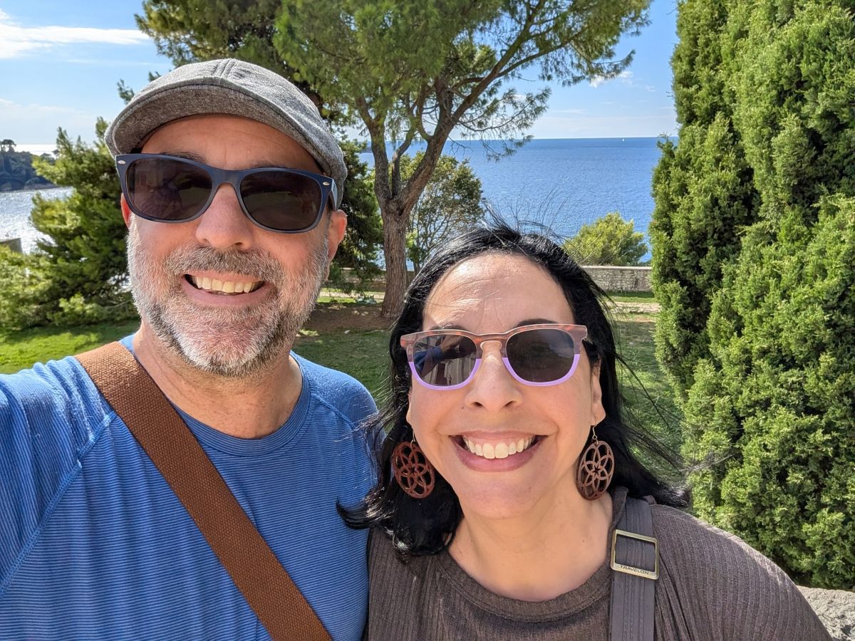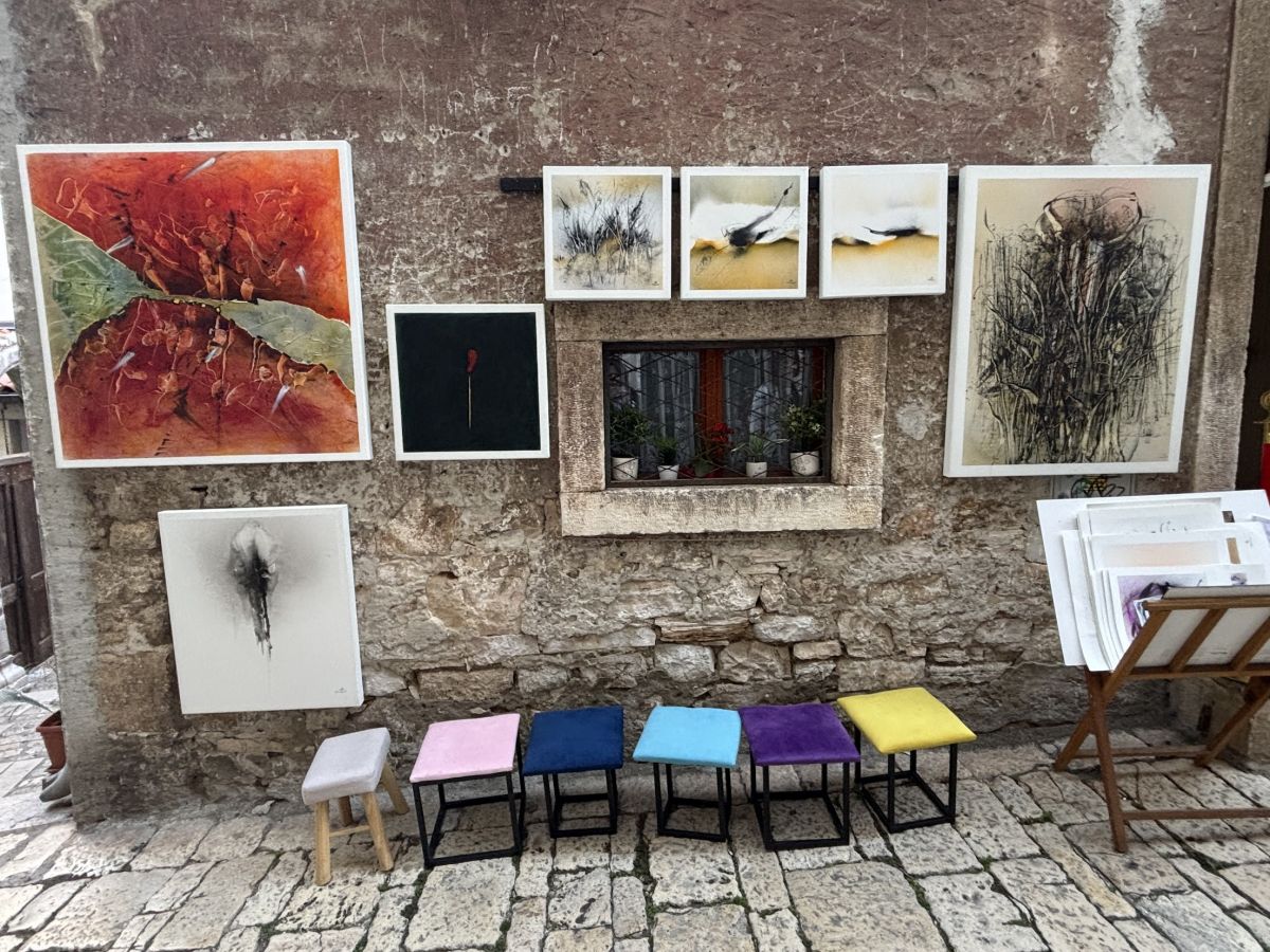 Up early, we walked to Accademia Bridge (Ponte dell’Accademia) for some early morning photos, then to Bar all’Angelo for pistacchio pastries and cappuccini. We took a water bus (vaporetto) to a stop across from the train station, where we’d meet Ella and Dražen. The Mercedes van fit all of us, plus our luggage, no problem. The drive to Rovinj was about three hours, with a brief stop at a place similar to an Autogrill (don’t recall the name) for a snack and bathroom break. We drove through Slovenia, but we didn’t stop, so I don’t count it as a country visited, even though technically we were in-country for a bit and got to enjoy the coastal views.