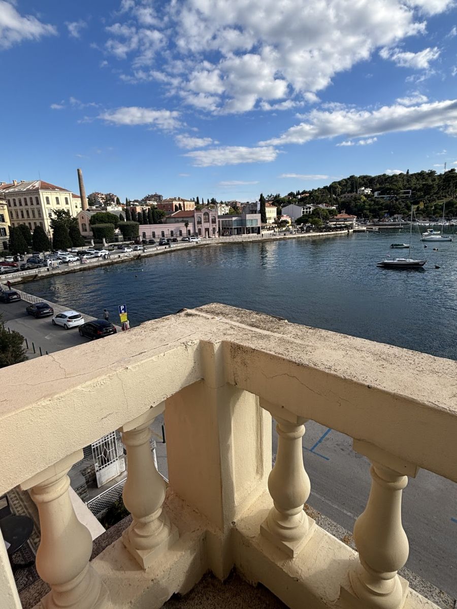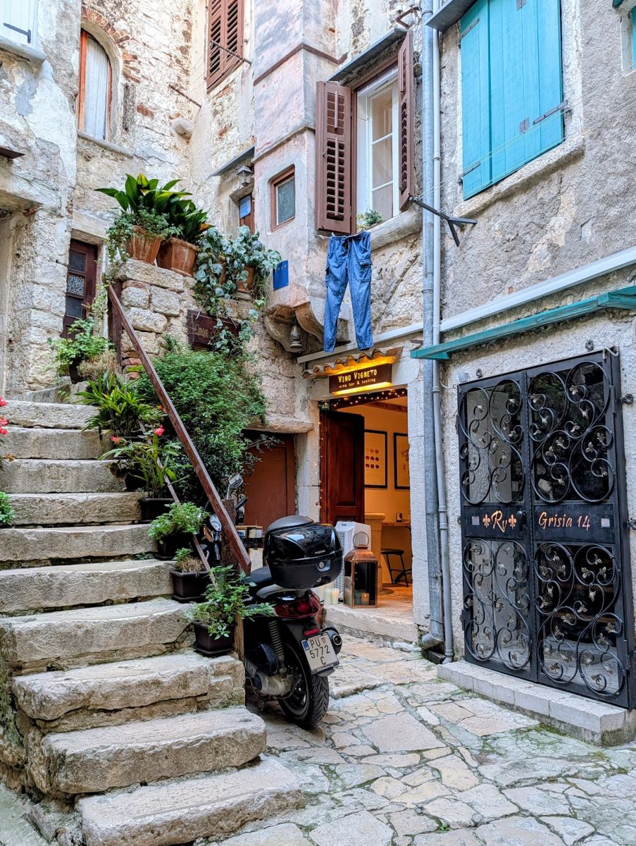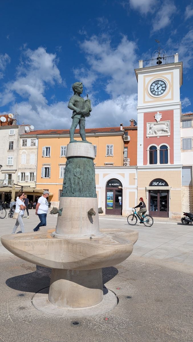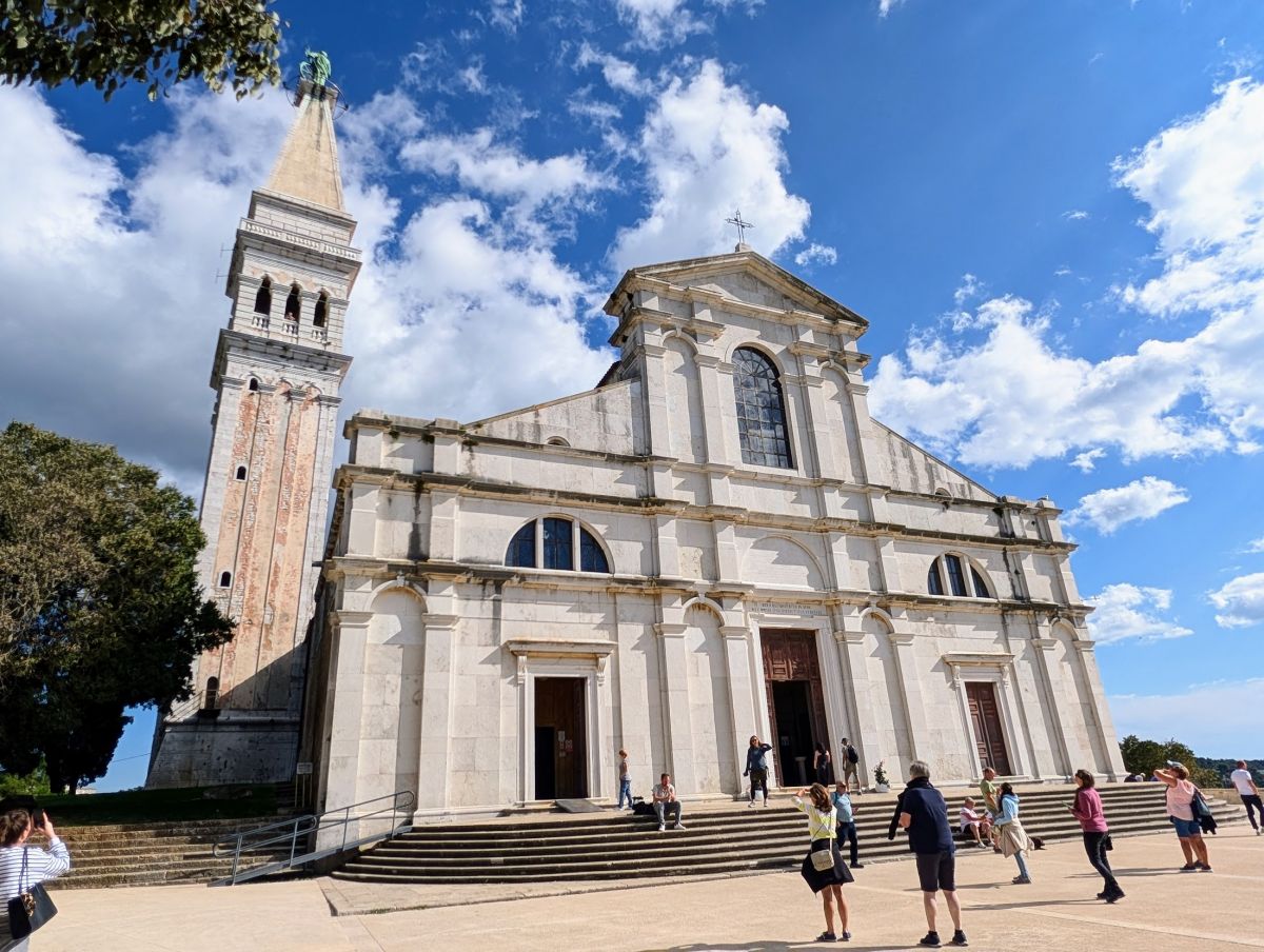No cars (except delivery trucks and other approved vehicles) are allowed in the old town section of Rovinj, so Dražen dropped us off about 2 blocks from our apartment. Ella helped us tote the luggage. After getting the keys from the owner and dropping off our luggage, Ella gave us a short walking tour of old town. What a spectacular little town! Our apartment was right on the water, and there’s a lovely promenade the follows the small harbor with its very blue water. Rovinj is known for its historic old town, featuring cobblestone streets, colorful Venetian-style buildings, and the prominent Cathedral of St. Euphemia, which stands on a hill at the heart of the town. The cobblestone streets are fairly steep in places, and worn smooth, so can be slippery. Wear grippy shoes!