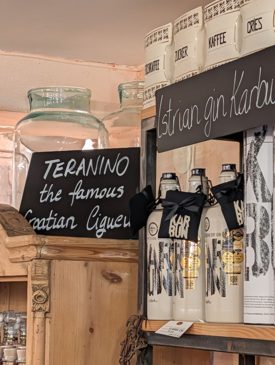 After cocktails, we did some shopping on the main street in old town. We sampled (and bought) some liqueur they’re known for in Istria called Teranino. It’s made from wine, and is delicious! It tasted like Christmas, with hints of cinnamon, clove, and cherry. Ella told us the best brand is Aura. We bought a bottle for the apartment, and another to bring home.