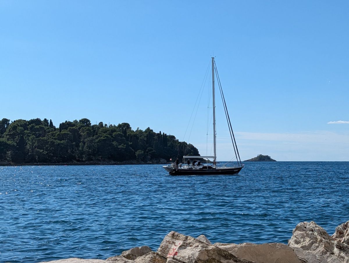 Up early, we walked to Accademia Bridge (Ponte dell’Accademia) for some early morning photos, then to Bar all’Angelo for pistacchio pastries and cappuccini. We took a water bus (vaporetto) to a stop across from the train station, where we’d meet Ella and Dražen. The Mercedes van fit all of us, plus our luggage, no problem. The drive to Rovinj was about three hours, with a brief stop at a place similar to an Autogrill (don’t recall the name) for a snack and bathroom break. We drove through Slovenia, but we didn’t stop, so I don’t count it as a country visited, even though technically we were in-country for a bit and got to enjoy the coastal views.