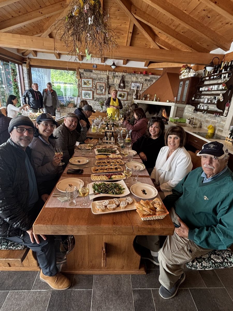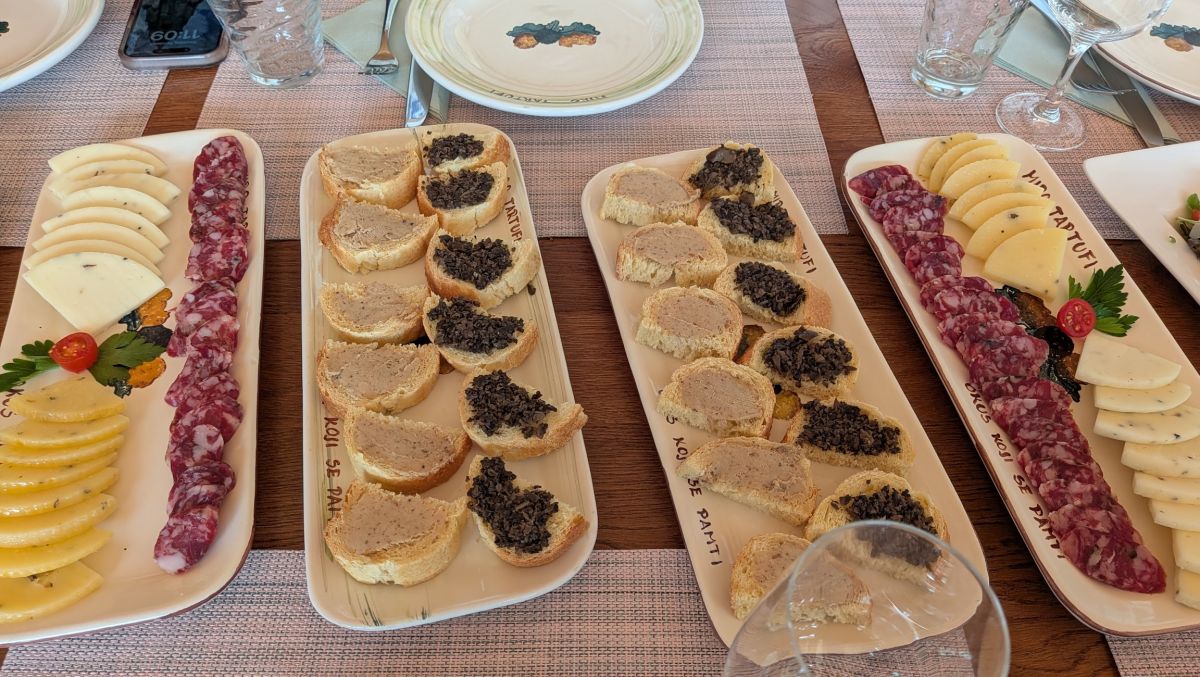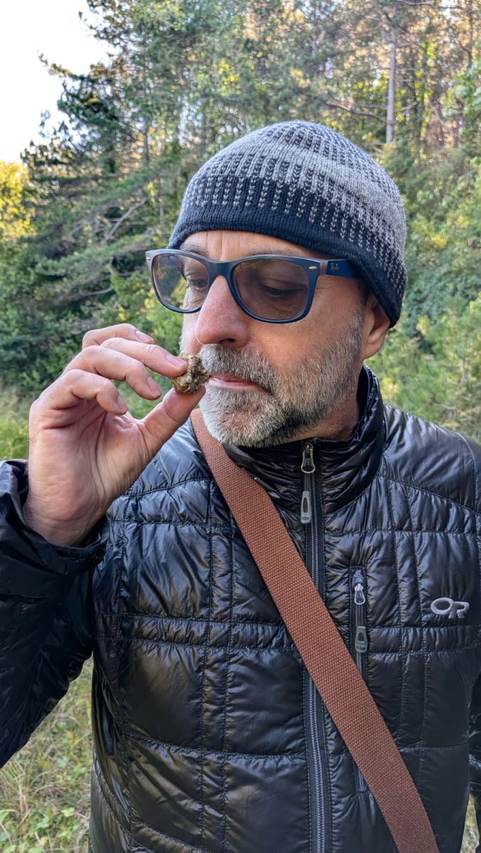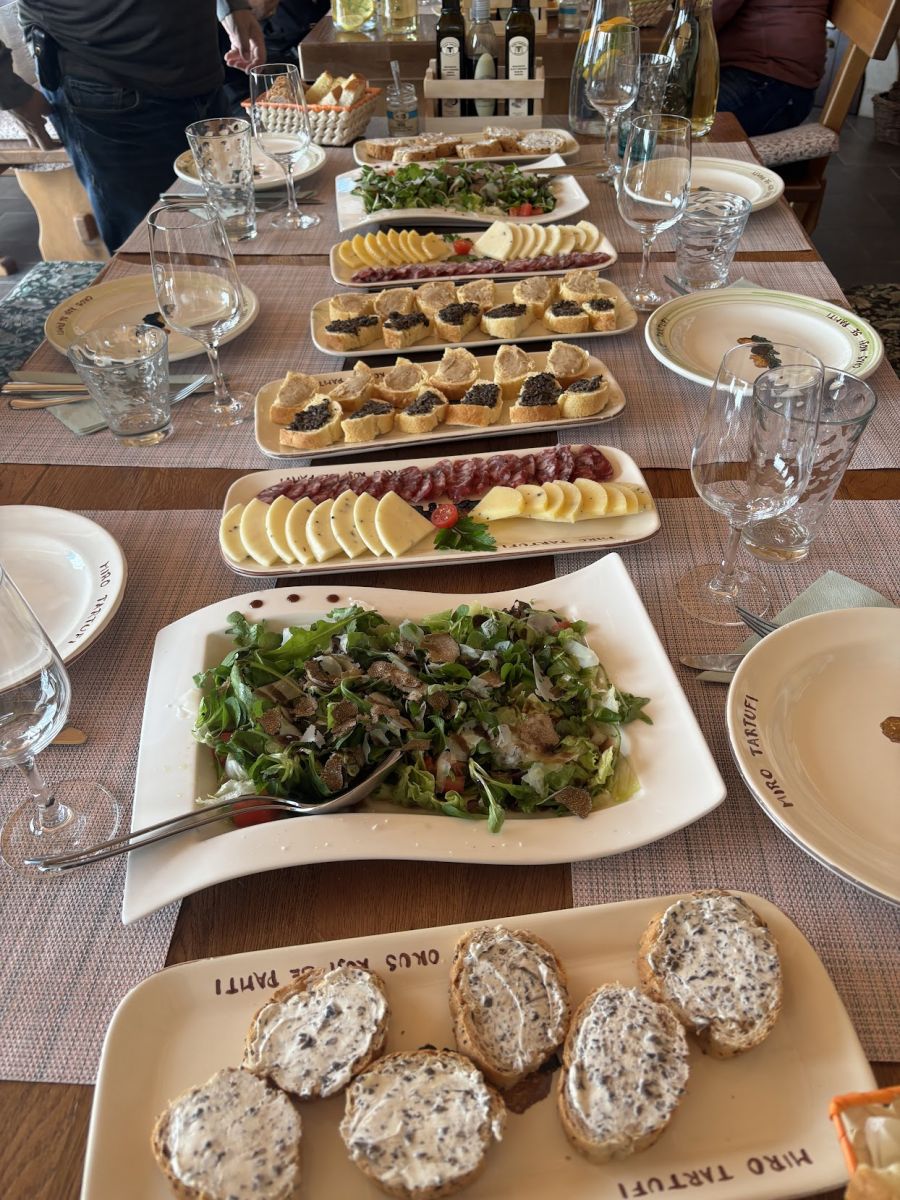 After the hunt, which took about an hour, we headed back to Miro Tartufi for a wonderful lunch prepared by the owner’s wife and daughter. First were bread rounds topped with a spread made from black truffle, olives, and garlic; more rounds topped with truffle butter; salami with bits of black truffle; two kinds of cheese; bread with cream cheese and black truffle; and a wonderful salad topped with shaved black truffle. All was served with a local white wine. After the first course, we had scrambled eggs made with truffles, followed by chocolate cake topped with grated white truffle.