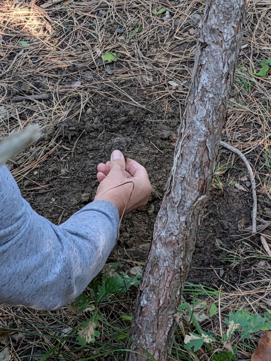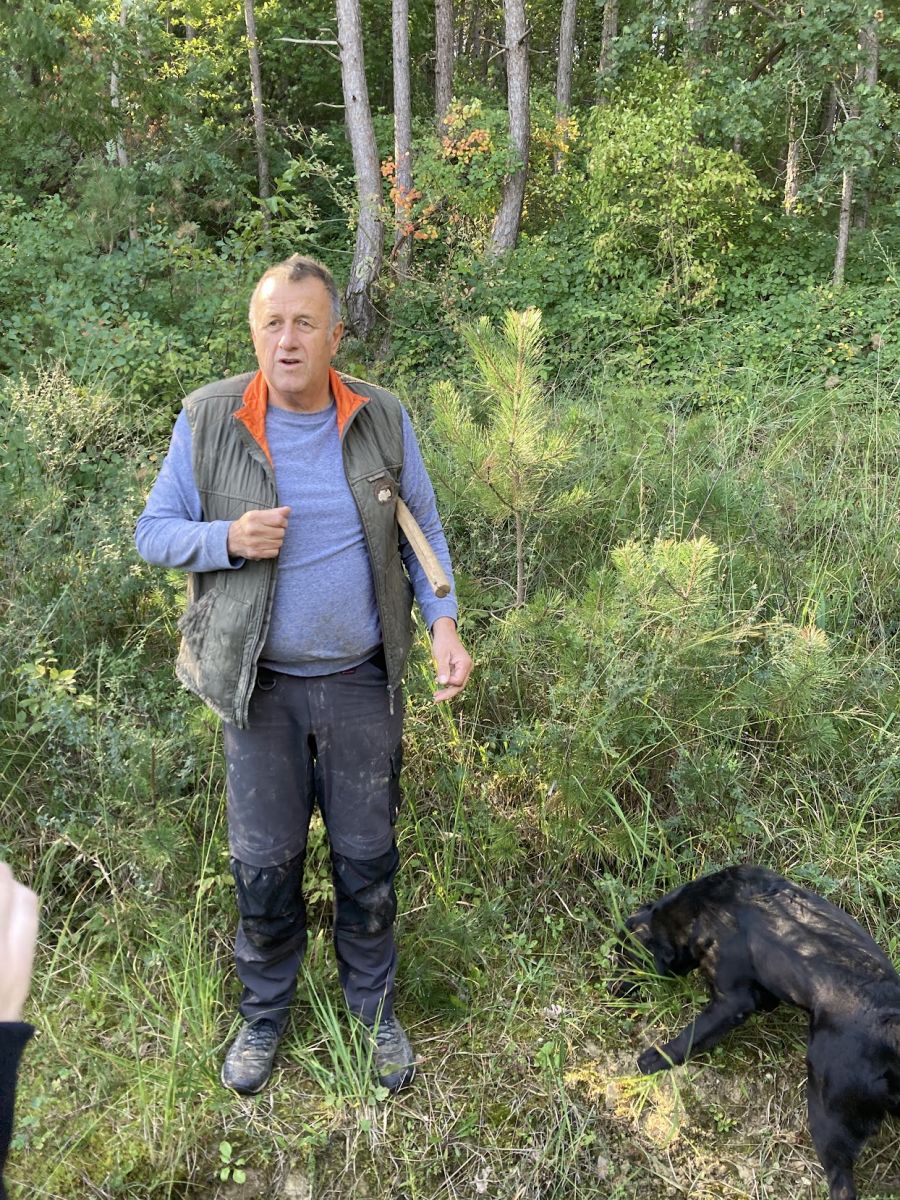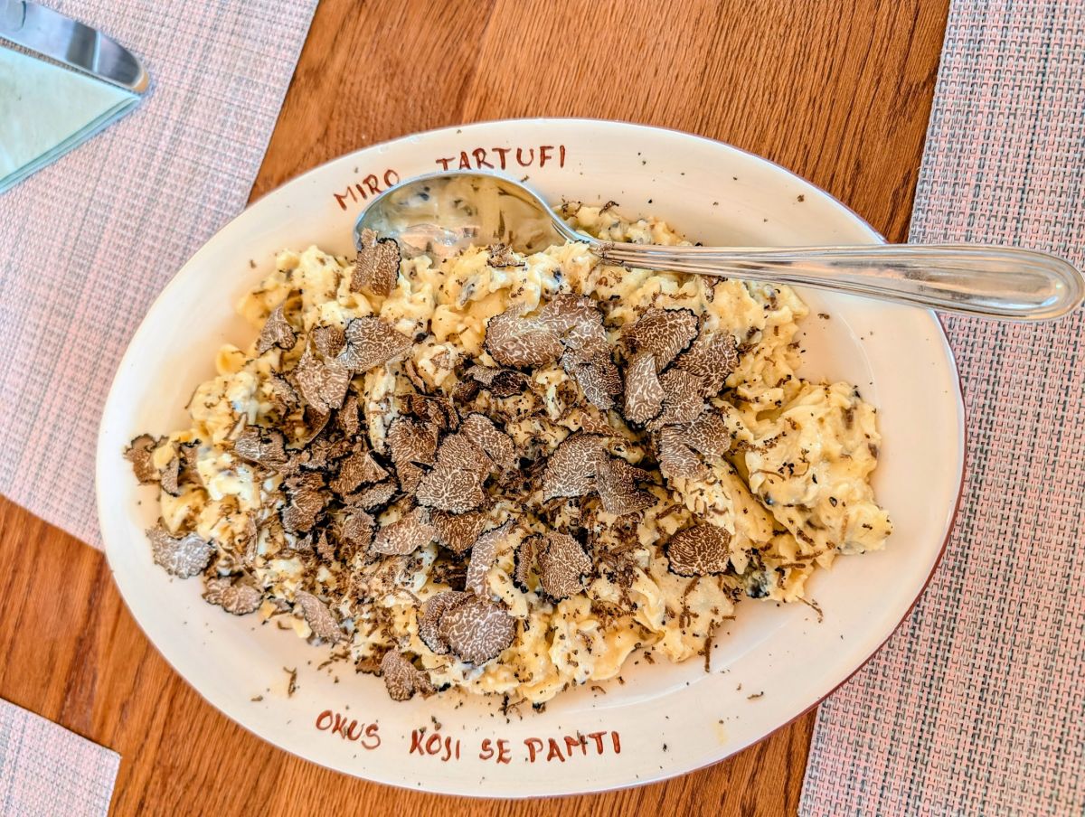 After the hunt, which took about an hour, we headed back to Miro Tartufi for a wonderful lunch prepared by the owner’s wife and daughter. First were bread rounds topped with a spread made from black truffle, olives, and garlic; more rounds topped with truffle butter; salami with bits of black truffle; two kinds of cheese; bread with cream cheese and black truffle; and a wonderful salad topped with shaved black truffle. All was served with a local white wine. After the first course, we had scrambled eggs made with truffles, followed by chocolate cake topped with grated white truffle.
