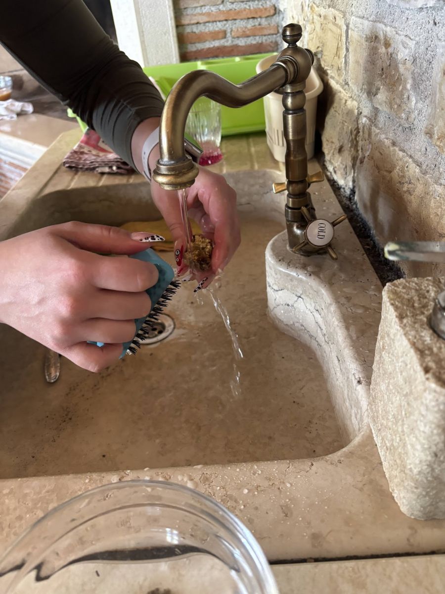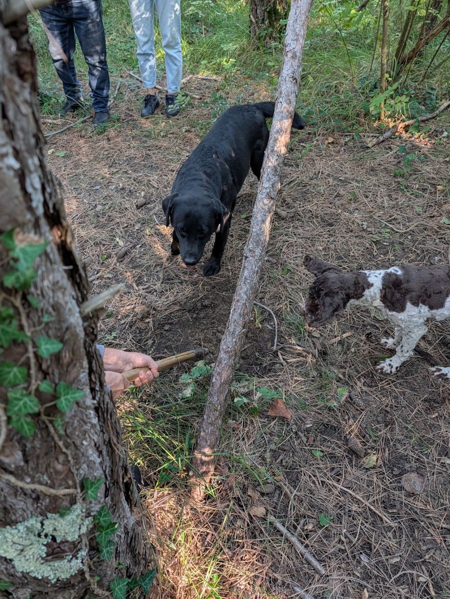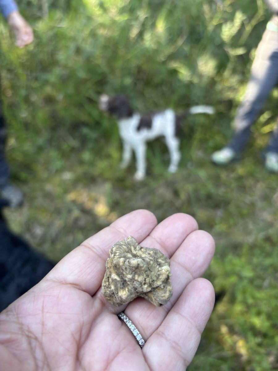 Today was a day trip into the mountains to go truffle hunting. We went to Miro Tartufi, just outside the hilltop town of Motovun. The owner took us into the forest with two of his dogs: Lila was a 5 year old black lab, and Jeki was a 6 month old Italian Water Dog (Lagotto Romagnolo). He has another dog (12 year old Bela), but said when training a puppy, it’s best with only one adult dog. The dogs found two small white truffles, and one medium sized black truffle.