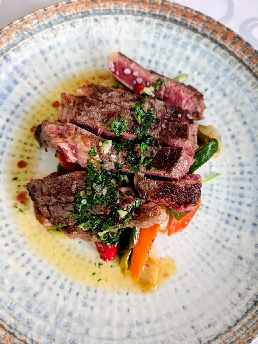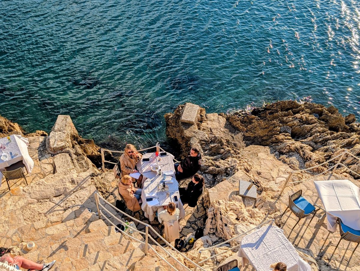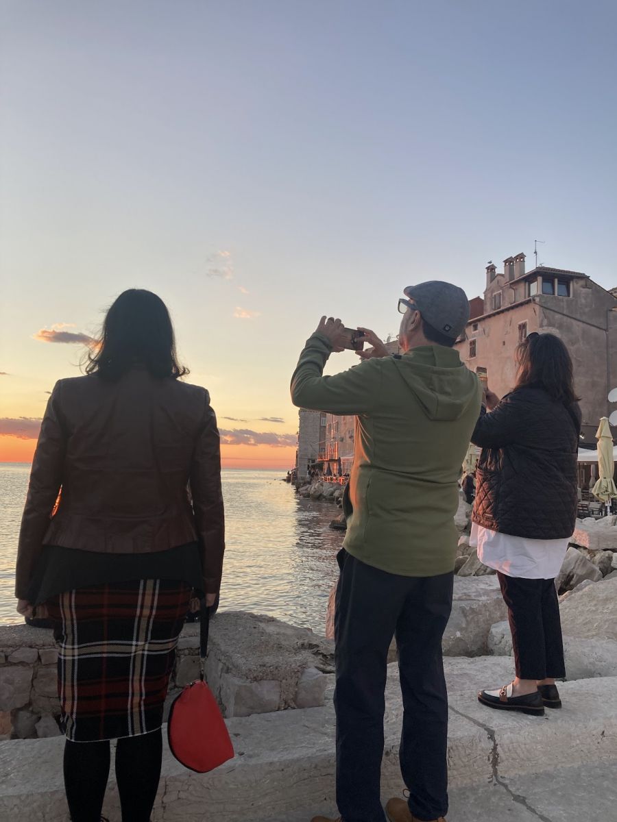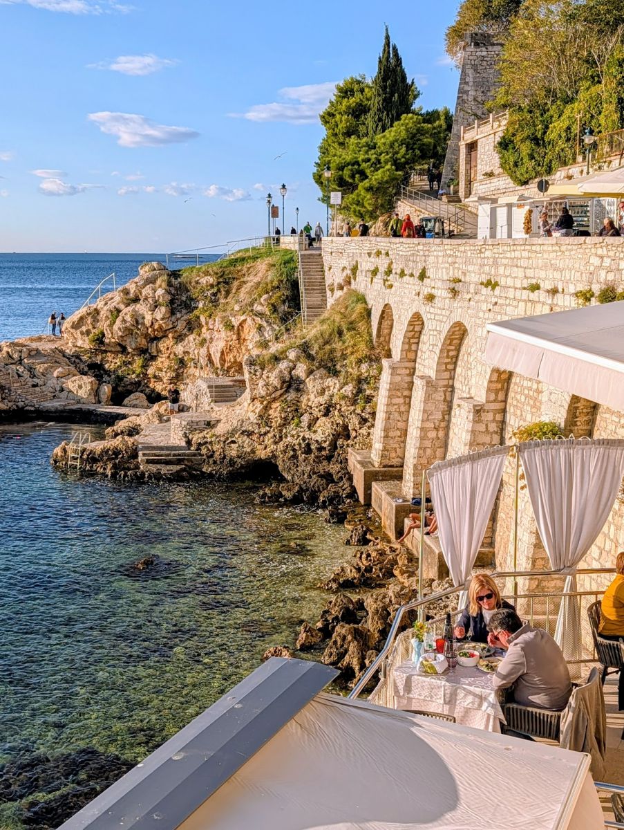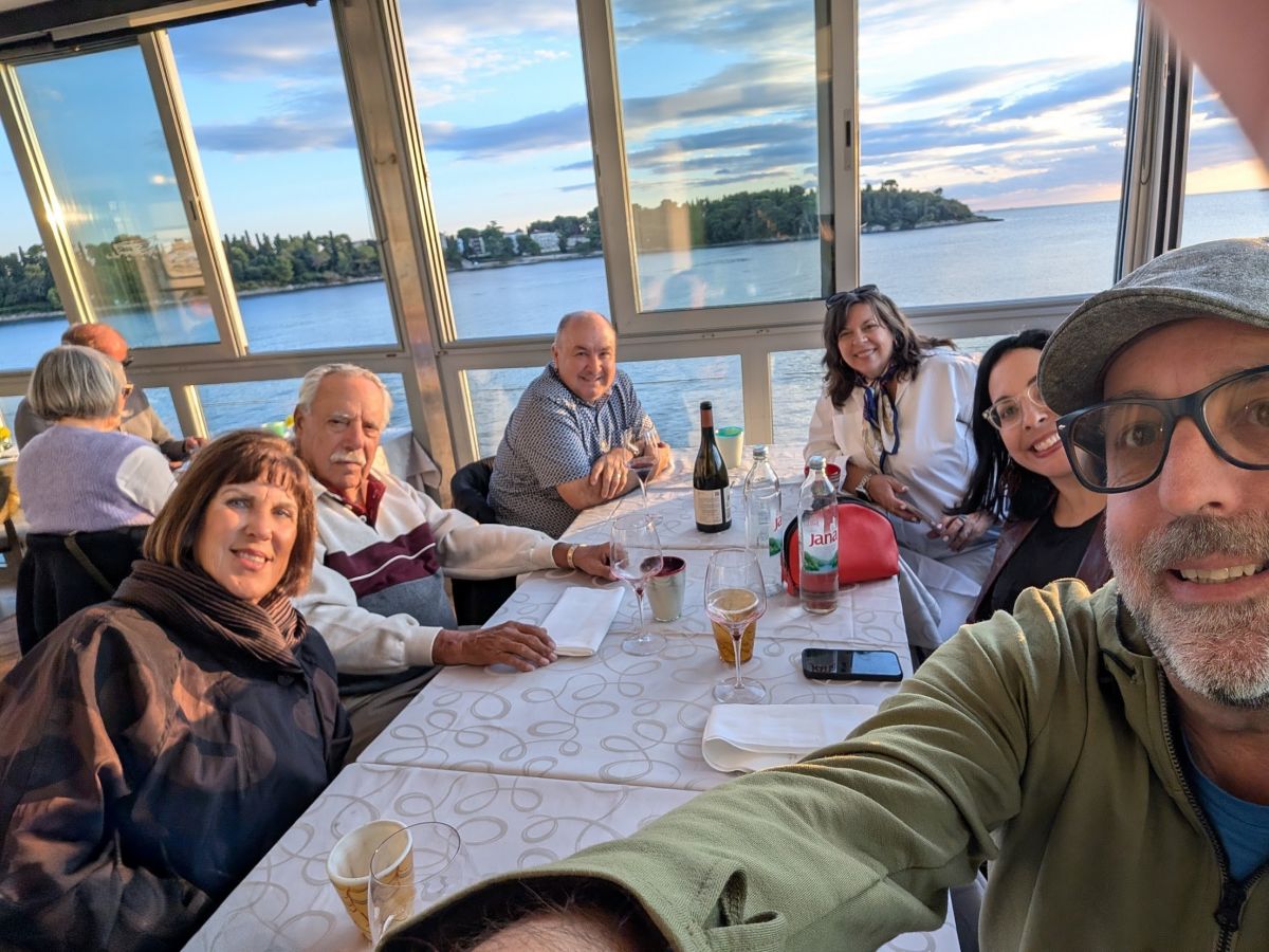 We got back to Rovinj at about 3:30pm, just in time for a short nap. After the nap, we took a stroll along the promenade on our way to dinner at Puntalina, which was spectacular. The restaurant is nestled along the cliff, not far from the Mediterraneo Bar. They had both indoor and outdoor seating, but the seats along the cliffs weren’t big enough for our group of 6, so we got a nice table inside with a great view. The food was the best so far on the trip. I had sliced ribeye with chimichurri on top of a bed of grilled veggies. It was loaded with flavor. (Tip: if you want medium rare meat in Croatia, order medium. To them, medium rare is basically rare.) Teresa had pasta with mushroom sauce. Everyone else had some form of fish.