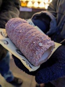 This delicious treat also goes by the name trdelník, which is a traditional spit cake originating from the northern part of the historical Kingdom of Hungary, now recognized as a popular pastry in the Czech Republic, Slovakia, and Hungary.