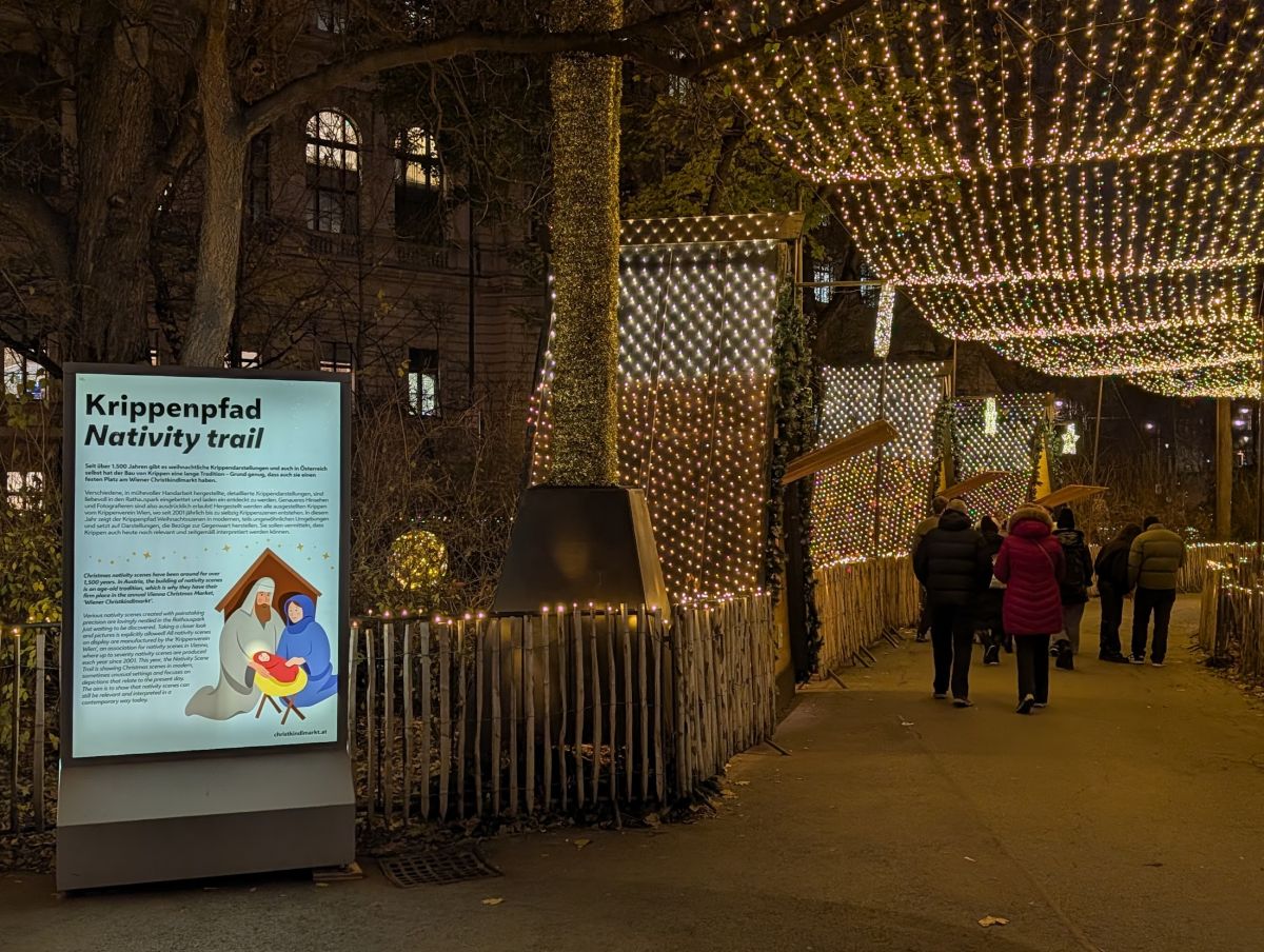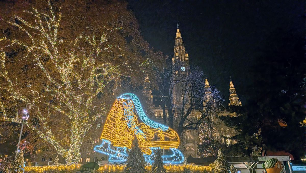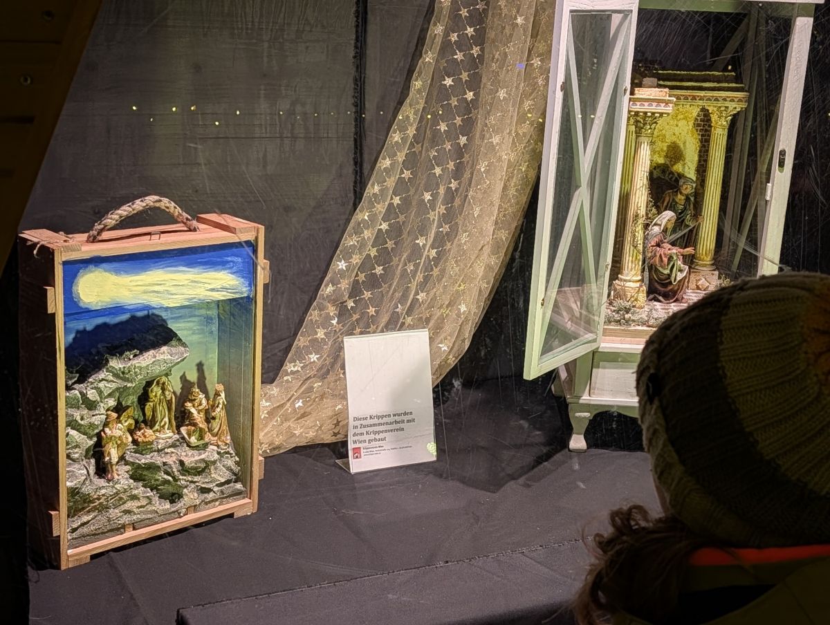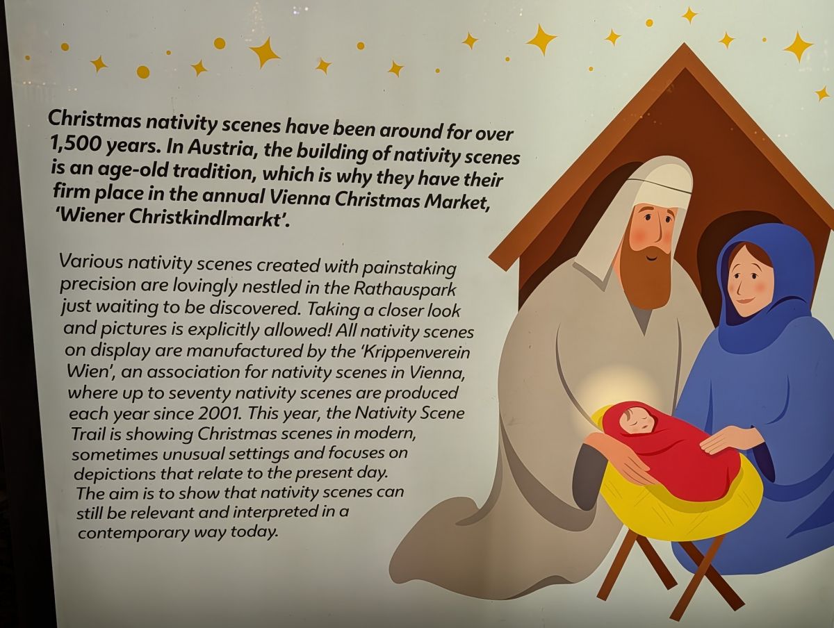 In the evening, we headed back to the Wiener Christkindlemarkt at Rathausplatz so we could see it at night. Apparently so did everyone else—it was very crowded! It really is spectacular at night. Not only the market stalls themselves, all lit up, but the surrounding park has lit displays throughout, and there’s a Nativity Trail with many different Nativity Scenes to look at. There’s also an ice skating track. It’s not a rink, it’s a meandering track that works its way around the park.