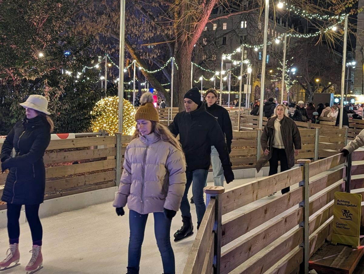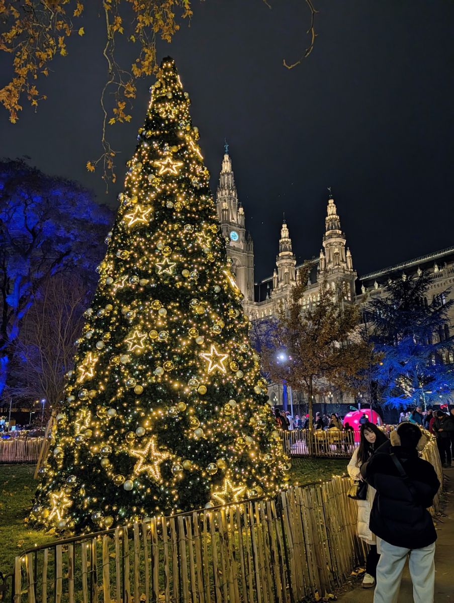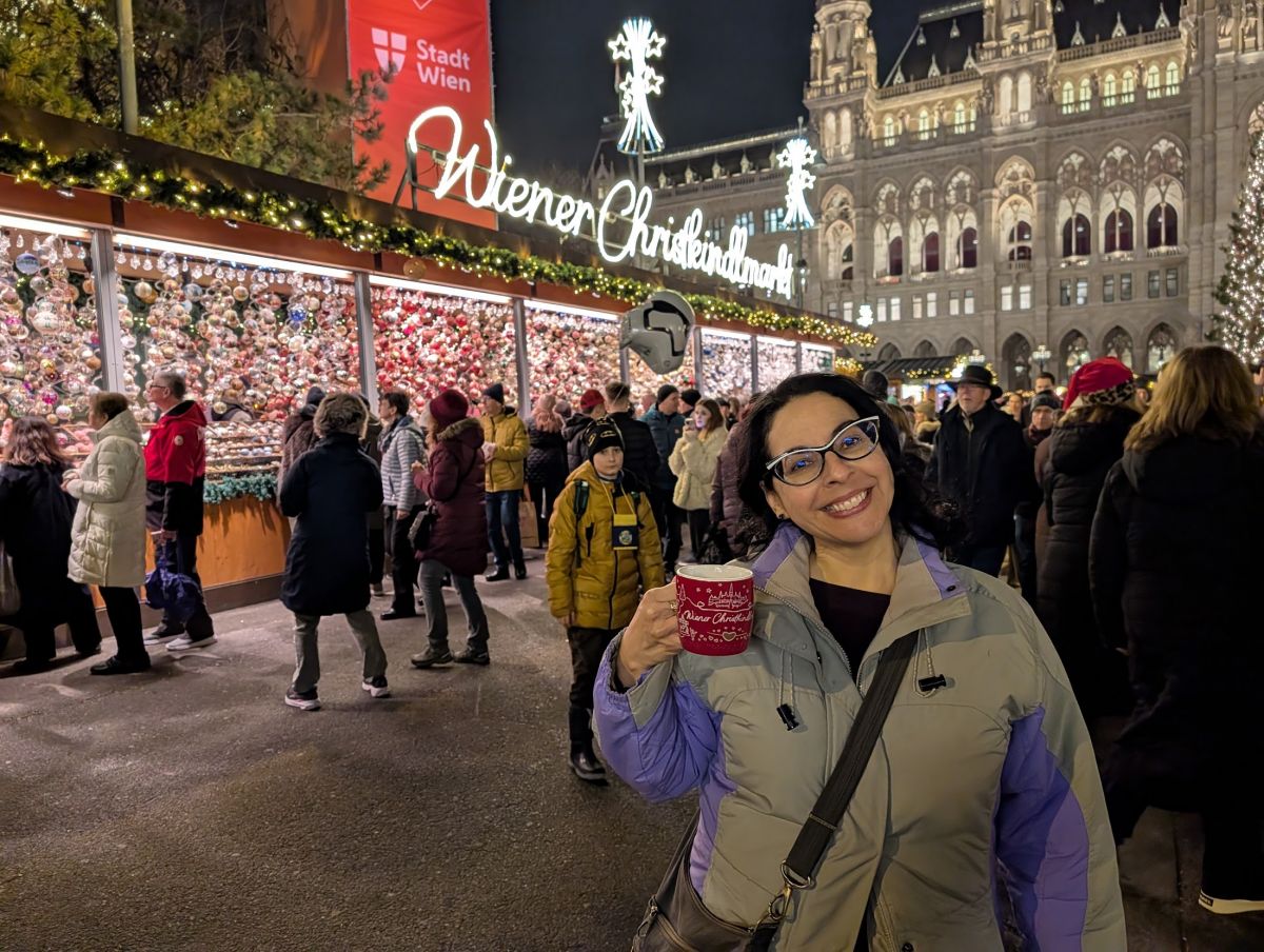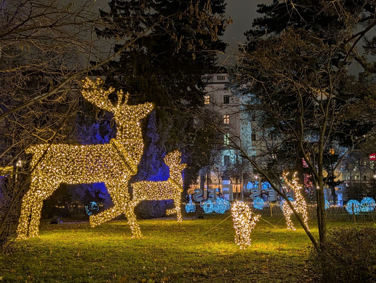 In the evening, we headed back to the Wiener Christkindlemarkt at Rathausplatz so we could see it at night. Apparently so did everyone else—it was very crowded! It really is spectacular at night. Not only the market stalls themselves, all lit up, but the surrounding park has lit displays throughout, and there’s a Nativity Trail with many different Nativity Scenes to look at. There’s also an ice skating track. It’s not a rink, it’s a meandering track that works its way around the park.