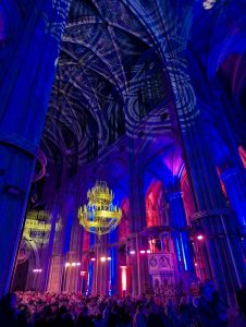 After the Christmas Market (and a quick drink at the Einstein Bar), we went to the Votive Church for the “Light of Creation” light show. Here’s how the Light of Creation website describes the show: