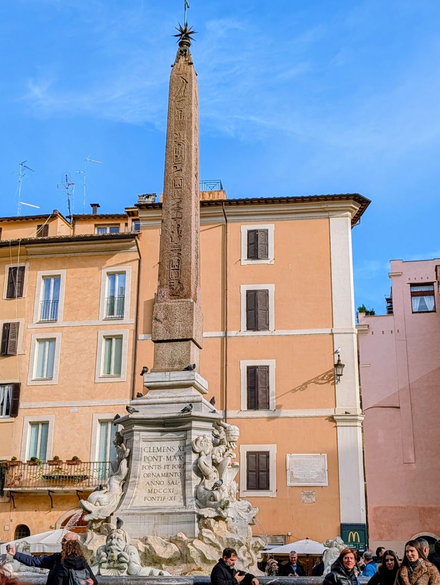 Later in the afternoon we headed to Piazza della Minerva to see the Elephant and Obelisk, a statue of an elephant carrying an obelisk, designed by the Italian artist Gian Lorenzo Bernini and unveiled in 1667. The red granite obelisk was originally erected by Pharaoh Apries of the Twenty-sixth Dynasty of Egypt, about 580 BC, in his capital Sais. The obelisk was rediscovered in 1665 during excavations near the church of Santa Maria sopra Minerva. It had probably been brought to Rome in the first century AD for the temple to the Egyptian goddess Isis that was located there. The obelisk is 5.47 meters tall and is the smallest of the 13 ancient obelisks present in Rome.