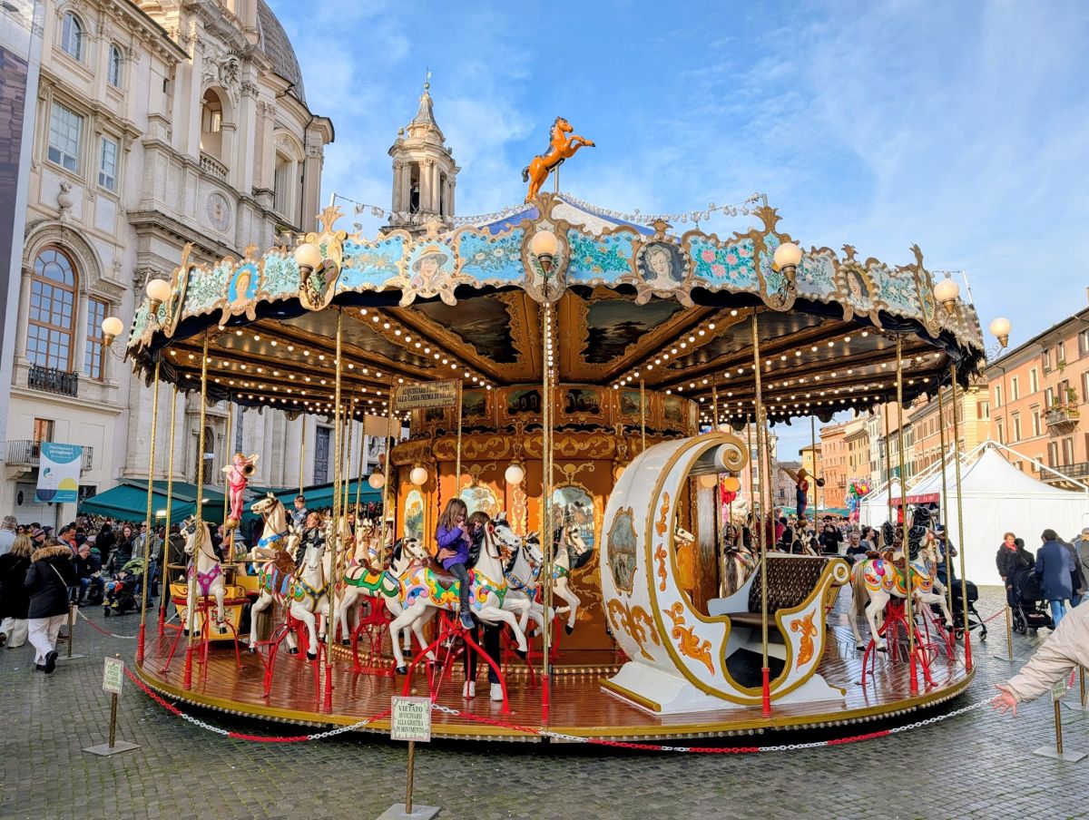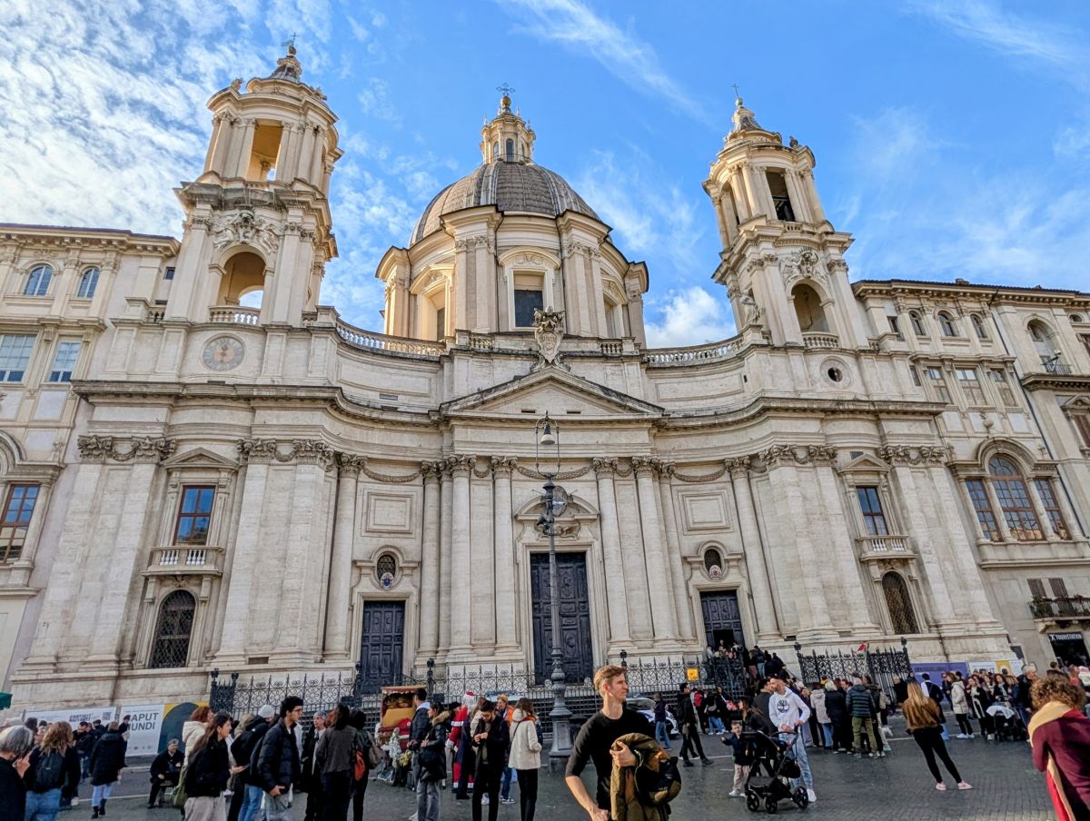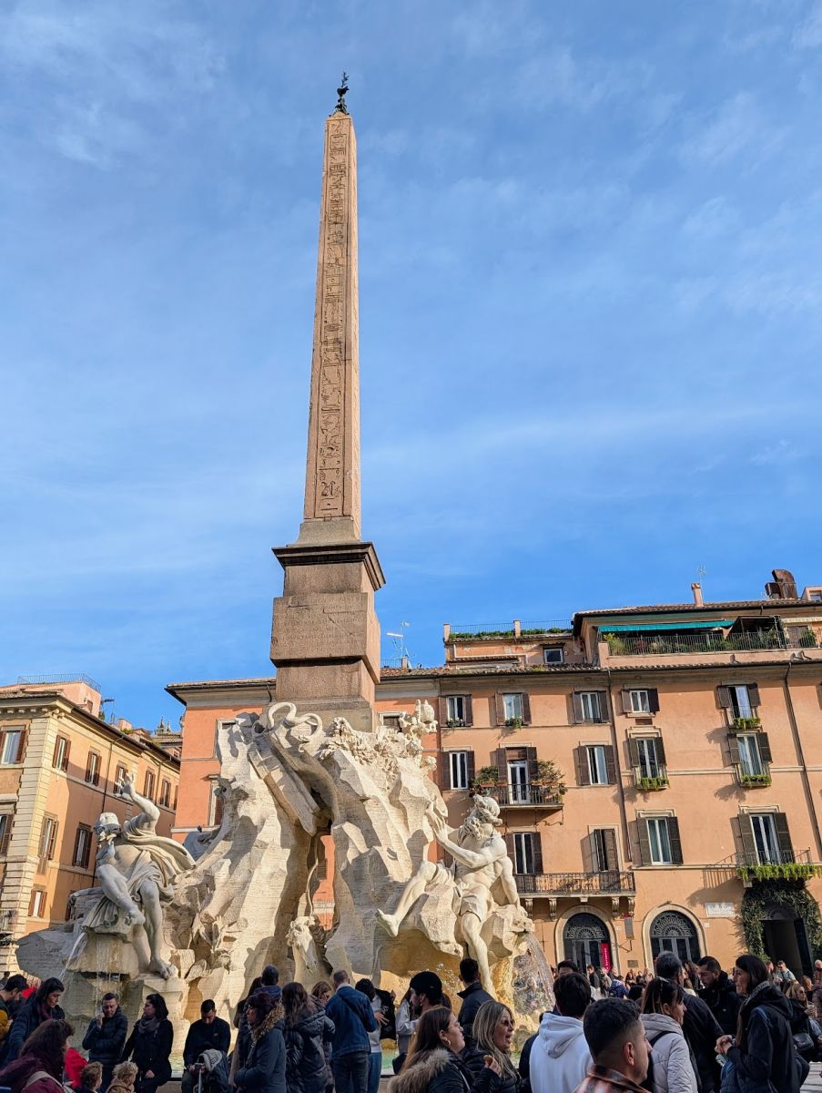 Just past Piazza della Minerva (visible from the northwest corner) is the back of the Pantheon. While the rear of the Pantheon had only a few people, the front side (in Piazza della Rotunda) was a sea of people. This was the largest and most dense crowd we’d yet experienced in Rome. We didn’t even attempt to go inside the Pantheon (we couldn’t even discern where the line was, as it was just wall-to-wall people). Instead, we headed for Piazza Navona, which is supposed to have the largest Christmas Market in Rome. It turned out to be a very underwhelming Market (but at least it had a carousel). Luckily, there were some other things to see in the piazza: Fontana del Nettuno (Neptune’s Fountain)—a 16th century marble fountain depicting cherubs and Neptune fighting an octopus; Fontana dei Quattro Fiumi—a 17th century fountain that’s an homage to 4 rivers, featuring an obelisk topped by a dove; and Fontana del Moro (Fountain of the Moor)—a 16th century fountain featuring dolphin & Triton sculptures,