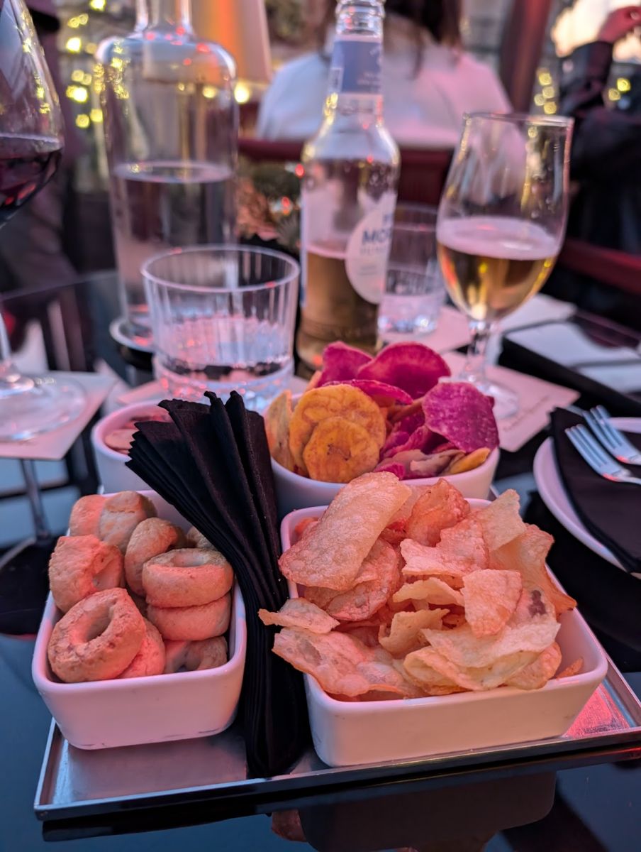 We had some very good focaccia with mortadella, steak tartare, and an assortment of chips, nuts, and crackers. (As well as cocktails.)