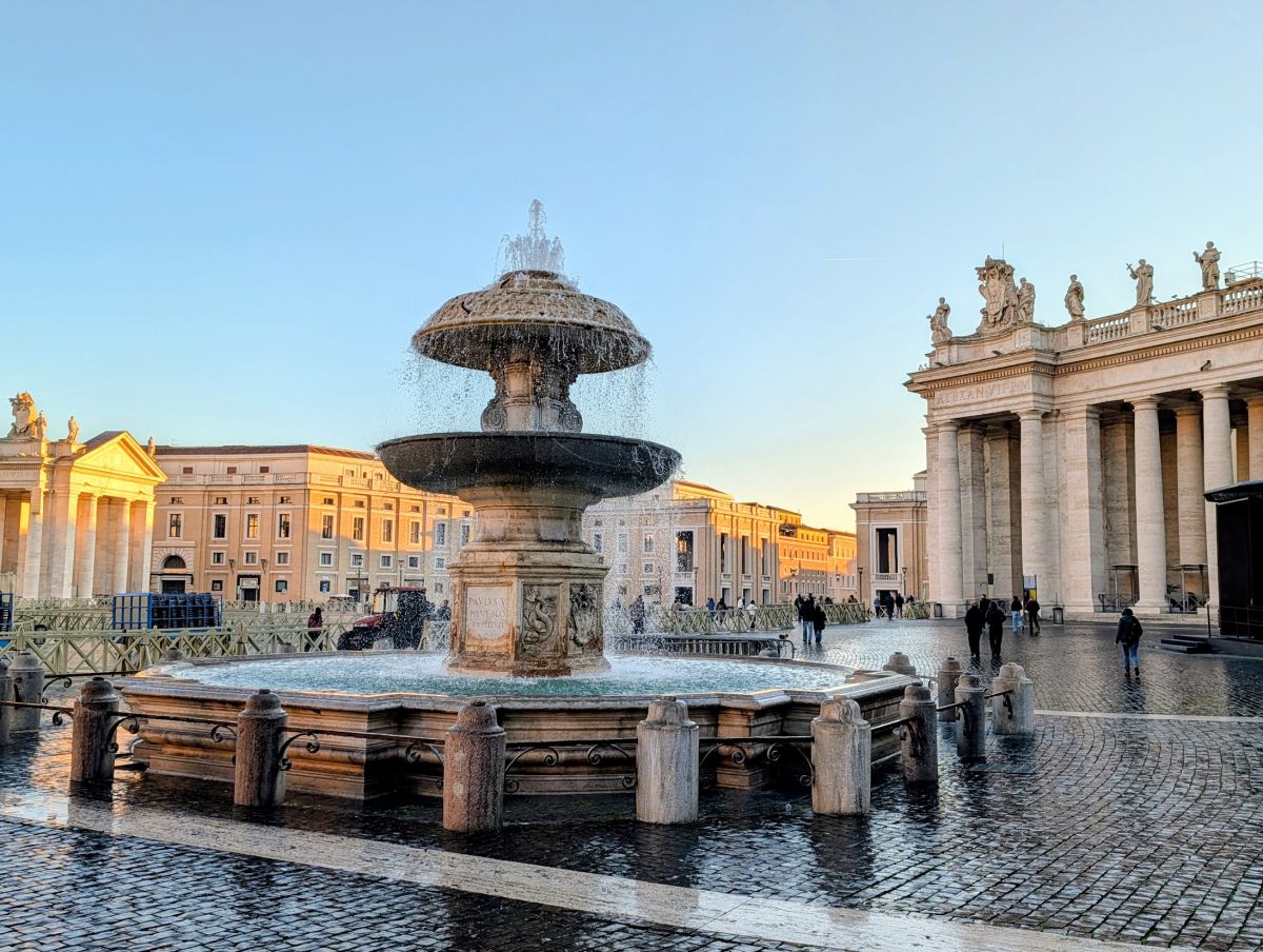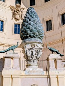 The Fontana della Pigna or simply Pigna (“pinecone”) is a former Roman fountain which now decorates a vast niche in the wall of the Vatican facing the Cortile della Pigna (Pinecone Courtyard). Composed of a large bronze pine cone which once spouted water from the top, the Pigna originally stood near the Pantheon next to the Temple of Isis. It was moved to the courtyard of the Old St. Peter’s Basilica during the Middle Ages and then moved again, in 1608, to its present location. The bronze peacocks on either side of the fountain are copies of those decorating the tomb of the Emperor Hadrian, now the Castel Sant’Angelo. The original peacocks are in the Braccio Nuovo Museum.