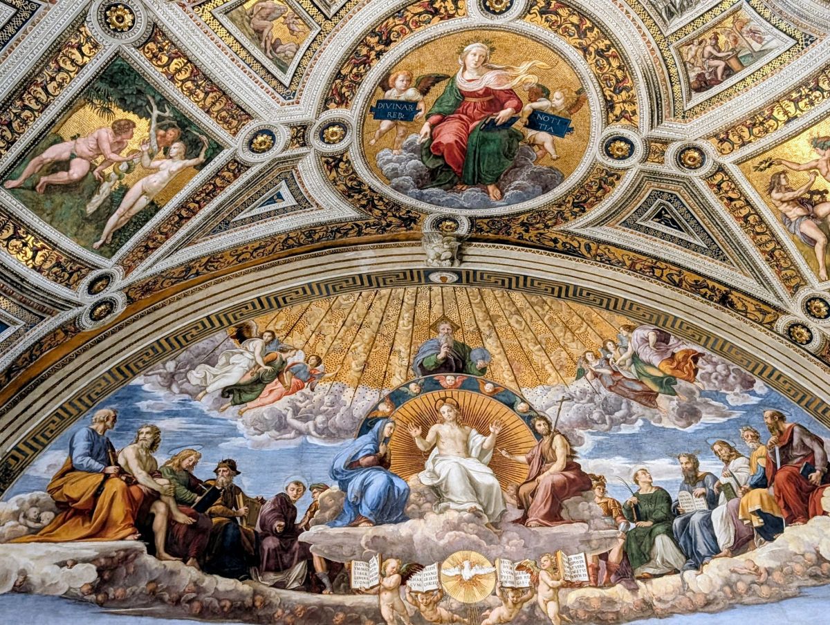 On the wall opposite The School of Athens is a fresco representing theology—The Disputation of the Holy Sacrament. For some reason I only captured the top half of the fresco, representing the celestial sphere. I completely cut out the bottom half, representing the earthly sphere.