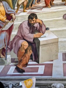 Below Plato is a brooding man seated in the foreground, hand on his head in a classic “thinker” position. The figure is of the philosopher Heraclitus, but it’s widely believed to be a portrait of Michelangelo. The Heraclitus figure was absent in Rafael’s preliminary drawings and sketches, and modern analysis proves it was added later.