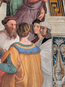 On the right side of the fresco, we see Ptolemy (wearing a yellow robe, holding a globe, with his back to the viewer). Just to the right of Ptolemy is a young lad in a dark cap staring side-eyed at the viewer. That’s a self portrait of Rafael himself.