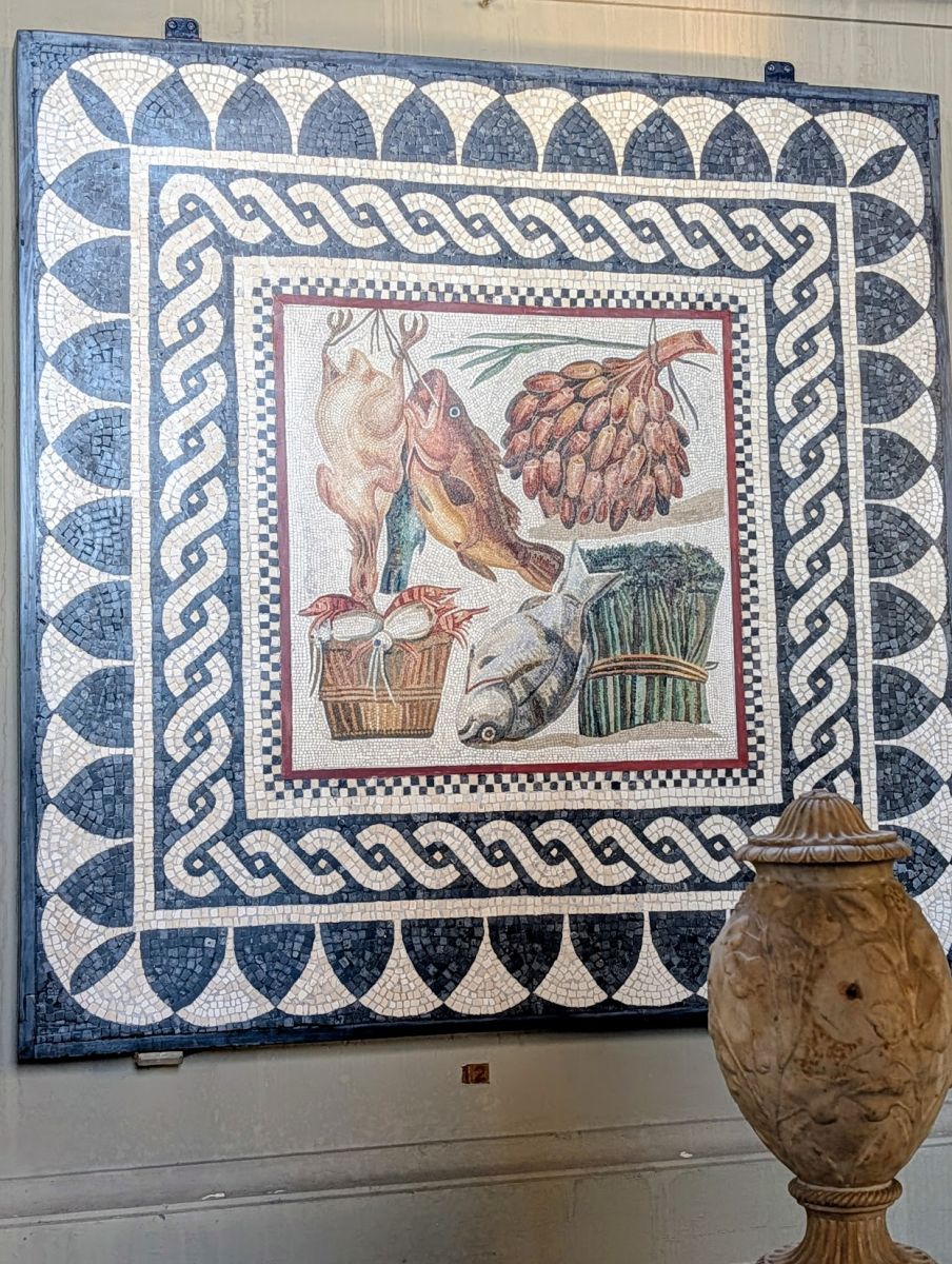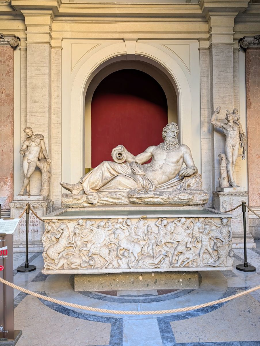 The tub is in the same room as the bronze Hercules statue, a mosaic floor from ancient Ostia Antica depicting the battle of the Centaurs, and several other statues, including those of Antinous and Emperor’s Galba and Claudius.