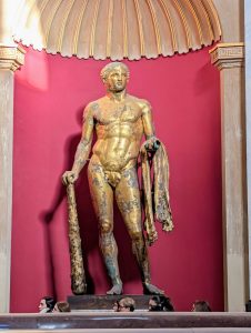 This gilded bronze statue was found in 1864 beneath the courtyard of the Palazzo Pio Righetti, near Campo de’ Fiori, and in the area of Pompey’s Theatre (where Caesar was assassinated). This is one of only a handful of ancient bronze statues that survived, as ancient Romans melted down most bronze statues to use the valued material elsewhere. The statue shows a young Heracles leaning on his club, with the skin of the Nemean lion over his arm, and the apples of the Hesperides in his left hand.