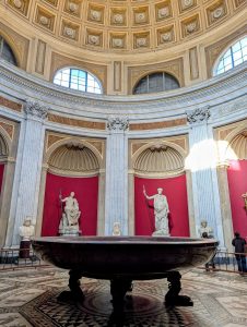 Emperor Nero’s bathtub is a prominent feature in the Round Room (also known as the Sala Rotonda). Commissioned during Nero’s reign (54–68 AD), the bathtub was originally part of his Domus Aurea, or Golden House, a vast palace complex built after the Great Fire of Rome. The tub is carved from a single slab of rare Imperial porphyry, a deep red-purple marble quarried exclusively from a single source in Egypt, which has never been found elsewhere. This material was highly prized in antiquity, symbolizing imperial power and wealth.