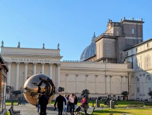 The Sphere within a Sphere is a bronze statue by Arnaldo Pomodoro, installed at the Vatican in 1990 in the Pinecone Courtyard (Cortile della Pigna). Pomodoro created numerous versions of the Sphere withing a Sphere, all in different sizes, with the version at The Vatican being the largest. They can be seen on display today in places including The Vatican Museums, Trinity College in Dublin, Ireland, The U.N Headquarters in New York, Mt. Sinai hospital in New York, Tel Aviv University in Isreal, University of California, Berkley U.S, Virginia Museum of Fine Arts U.S, Tehran Museum of Contemporary Art Iowa U.S, Columbus Museum of Art, Iowa, De Young Museum in San Francisco U.S, Hirshhorn Museum in the sculpture garden in Washington D.C and the Christian Theological Seminary in Indianapolis U.S.
