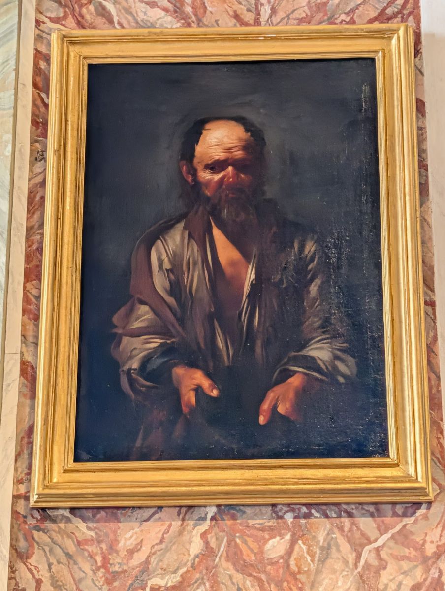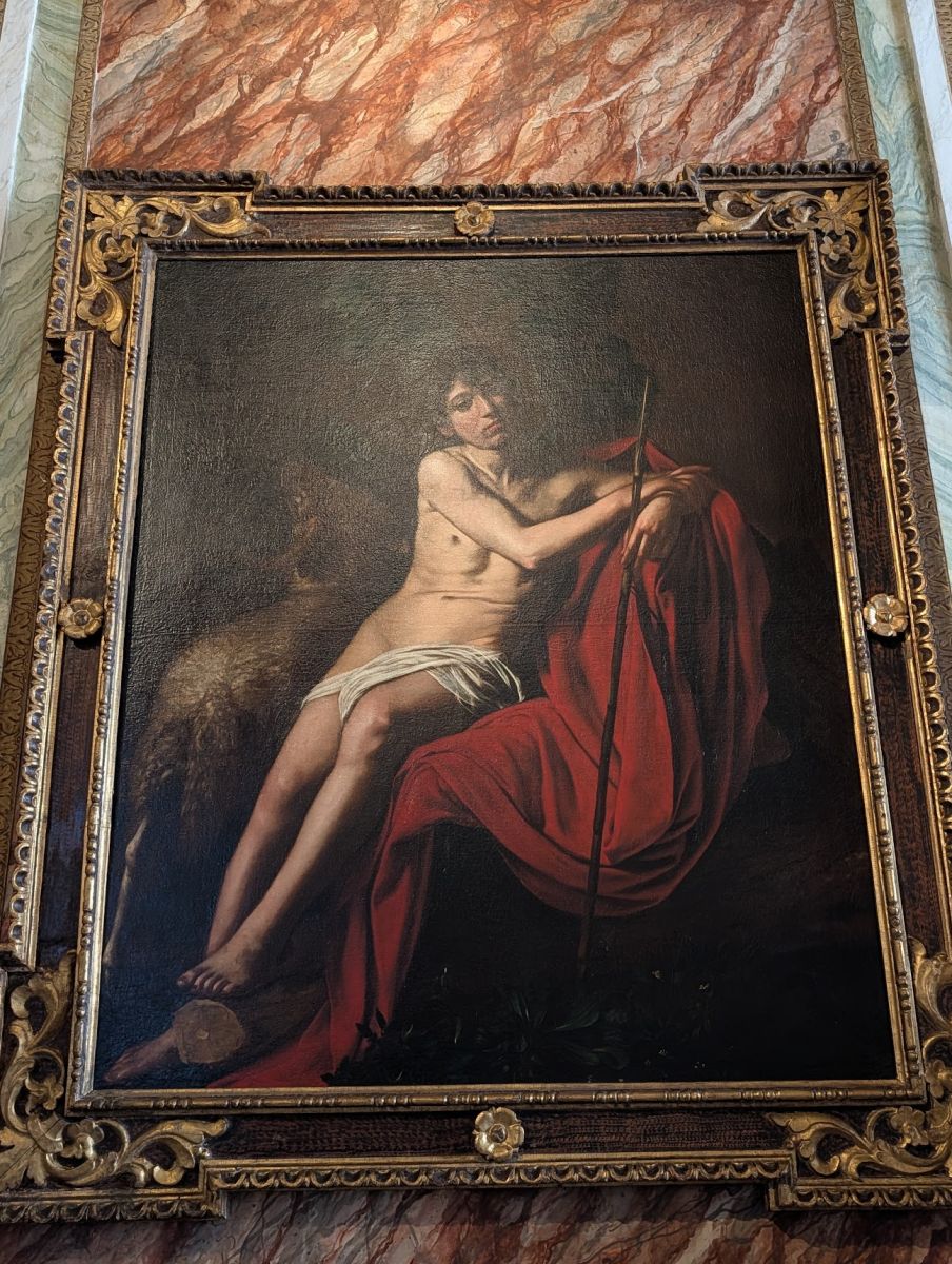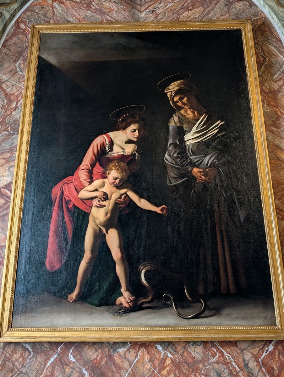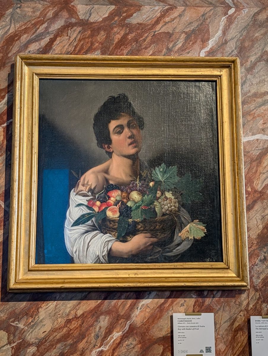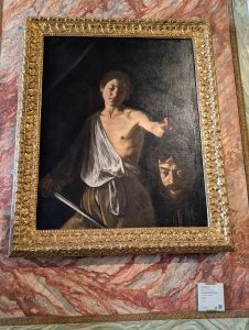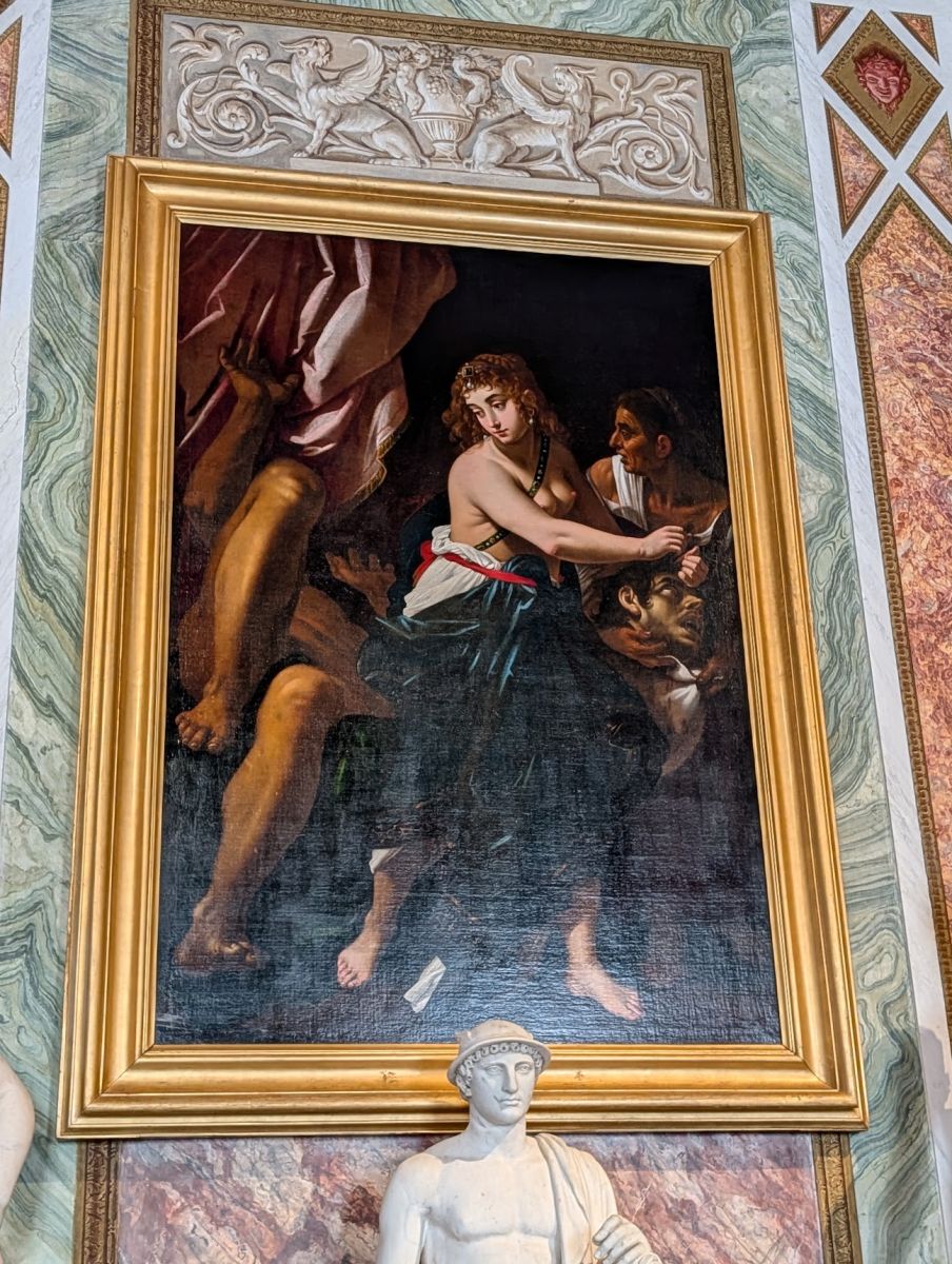 The gallery also features quite a few paintings by Caravaggio (whose real name was Michelangelo Merisi, but since Michelangelo was taken, he went by the town he was from: Caravaggio). His paintings have been characterized as combining a realistic observation of the human state, both physical and emotional, with a dramatic use of lighting, which had a formative influence on Baroque painting. He was also a scoundrel, frequently jailed for fighting, dueling, harassing city guards, possession of illegal weapons, and was once sued by a tavern waiter for having thrown a plate of artichokes in his face.