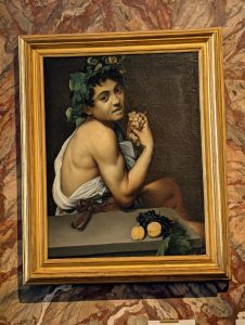 This is an early painting by Caravaggio, dated shortly after his arrival in Rome in 1592. At one point, Caravaggio fell extremely ill and spent six months in the hospital. Scholars believe he may have had malaria. The painting, which is a self-portrait depicting a young Bacchus with yellowish skin and eyes, adds to that theory. This painting was among the many works in the collection of Giuseppe Cesari, one of Caravaggio’s early patrons, which was seized by the Cardinal Scipione Borghese in 1607, together with the Boy Peeling Fruit and Boy with a Basket of Fruit. Cardinal Borghese’s uncle, the Pope, had Cesari jailed on made-up charges so that his art collection could be seized.