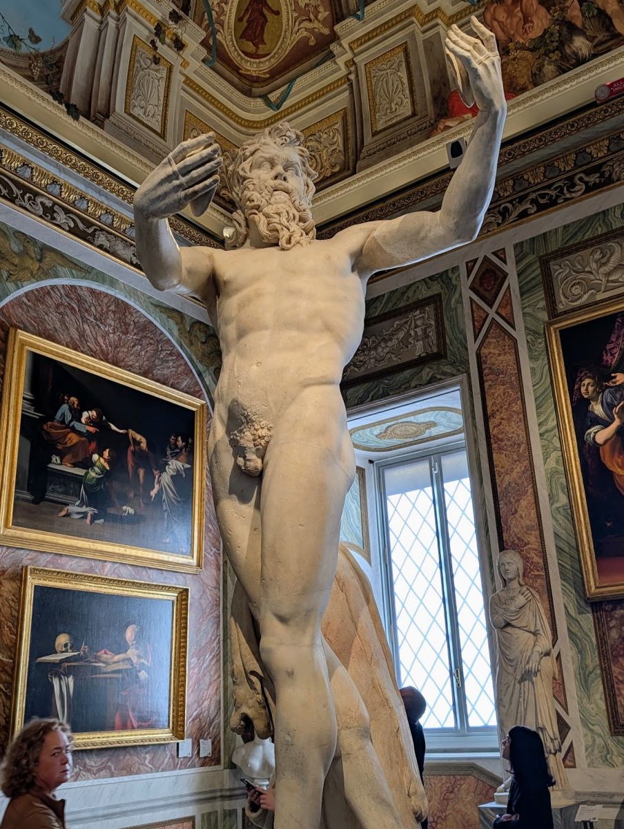 Much of what’s on display today was here in the 1600’s when the gallery was built, although a large number of pieces are now in the Louvre in Paris, essentially stolen by Napoleon. In the early 1800’s, after Camillo Borghese (great-grandnephew of Sciopone) married Napoleon’s sister, Napoleon “pressured” (forced) him to sell over 300 pieces of antiquity to France so that Napoleon could stock his the Louvre (which he had temporarily renamed Musée Napoléon). Still, what remains at Galleria Borghes is one of the finest collections in the world.