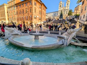 At the base of the steps, the Fontana della Barcaccia, a Baroque fountain often attributed to Pietro Bernini, features a boat-like sculpture inspired by a vessel stranded during a Tiber flood in 1598.