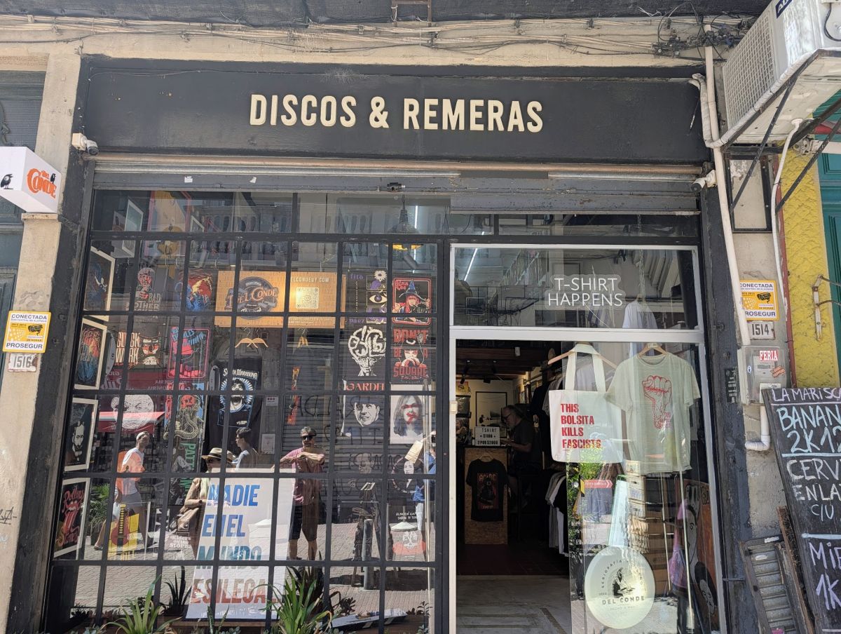 On our way to the Mercado for lunch, we found a store selling vinyl (+ CDs), t-shirts, and posters. The t-shirts and posters were all made in-house. The store name is Del Conde, but the big sign outside says “Discos & Remeras”, so you might think that was the name. They had a large photo of Woody Guthrie holding his guitar that says “This machine kills fascists”, which the store co-opted for their tote bags that say “This bolsita kills fascists”. I bought a t-shirt, but wished I had room for more.