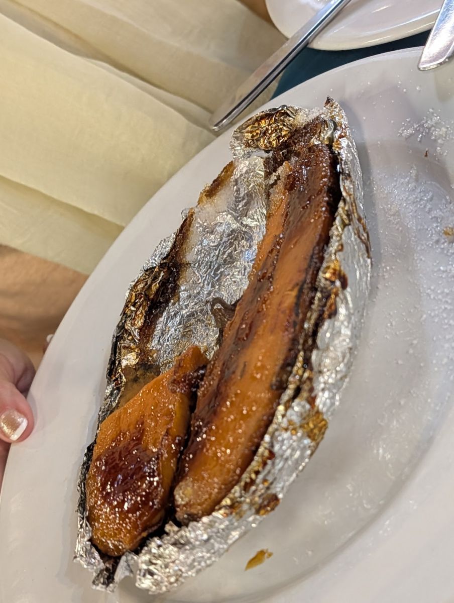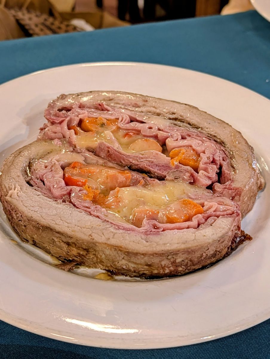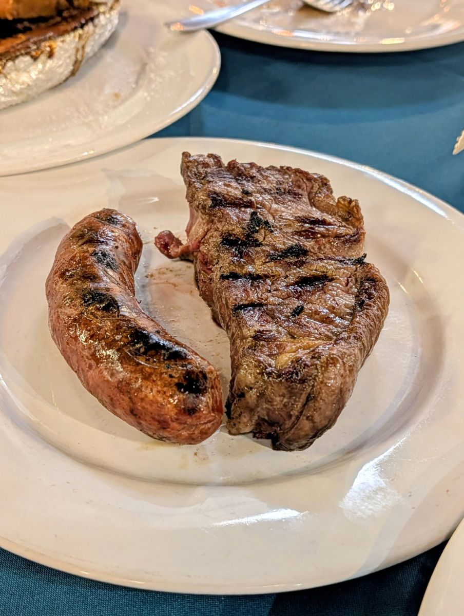 Inside the Mercado are several restaurants serving grilled meats. We ate at Estancia del Puerto, which is Daniel’s favorite, and a place his grandfather used to eat as well. It’s also where Anthony Bourdain ate on his first of two episodes in Montevideo. They offer a set meal (basically a sampler) depending on the number of people, but Daniel advised that it’s too much food, and you don’t get to choose what you get, so we opted for à la carte. We ordered chorizo, matambre relleno (beef rib cap stuffed with ham, carrots, and cheese), petit entrecot (sirloin steak), as well as grilled glazed sweet potato (the top was like the top of crème brûlée…you could crack it with your fork), grilled cheese, and caprese salad. Needless to say, we were stuffed!