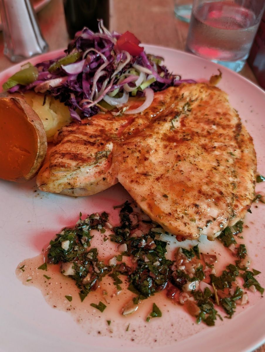 After our caffeine break, we wandered around Ciudad Vieja (Old Town) a bit before deciding on lunch at La Tabla. Both of our dishes were tasty, but overly salted (which was odd, because so far, we’ve noticed they tend to under-salt and let you add your own). 3 out of 5 stars. We were sitting underneath a red umbrella, and the sun hit it just right so that everything on our table was tinted red. (That’s why the photo of my chicken looks a bit odd…)