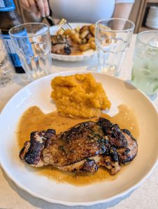 We went back to Feltrinelli bookstore (our third trip!) for lunch, because when we where there the day before, we saw someone eating a plate of chicken that looked really good. (It was really good!) We both got the chicken thigh in white wine sauce. I chose puréed pumpkin as my side, and Teresa had rosemary roasted potatoes. Both were delicious.