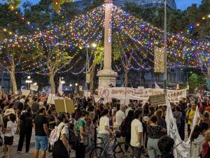 As the protest began to move, marching down Avenue 18 de Julio towards Plaza Libertad, we joined in and marched the 8 blocks with the group, which added more people along the way. The street (one of the main streets in Montevideo) shut down the entire way, with about 2,000 protesters marching down the middle of the street, and protesters using long banners to block the side streets. People didn’t seem to mind too much, as I’m told it’s not an unusual occurrence. What really surprised me, though, was that there wasn’t a single police officer in sight anywhere along the route. Not even watching from the fringes or side streets.