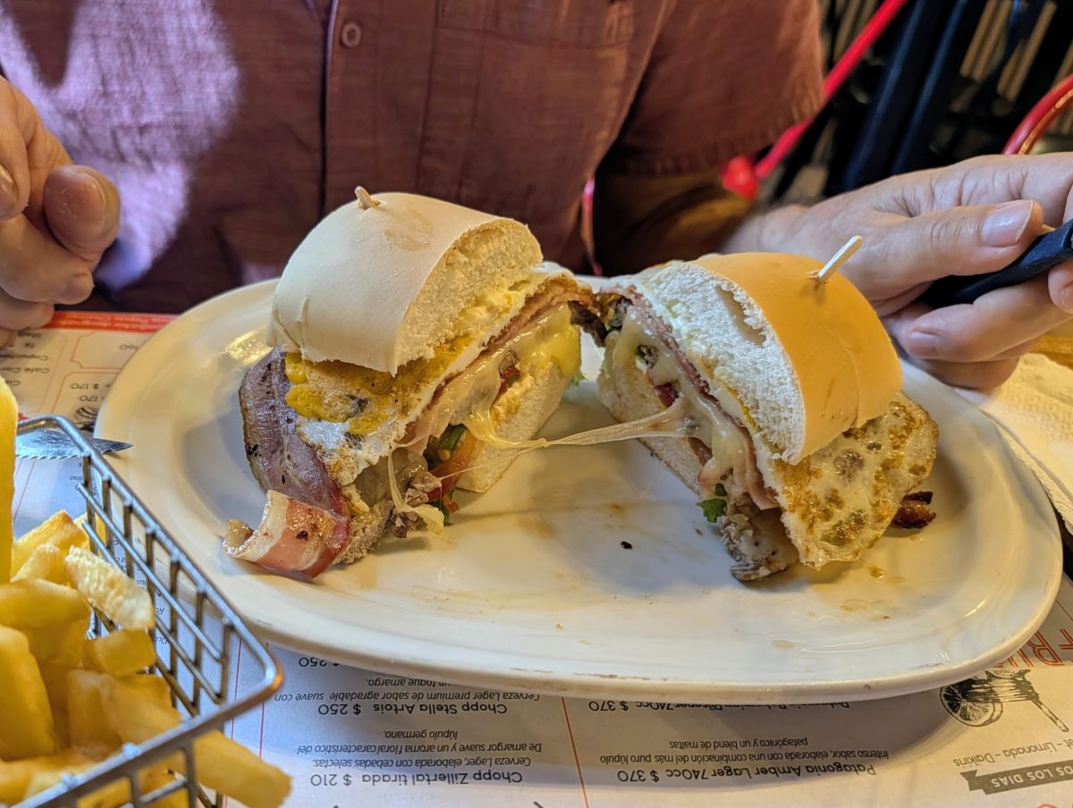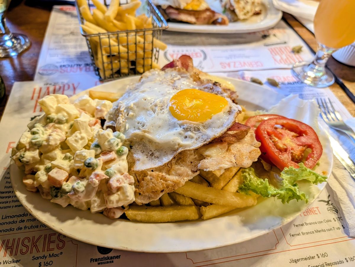 Chivito is the national dish of Uruguay. It’s traditionally made with beef, but is often made with chicken instead, and usually has ham, mozzarella, a fried (or hard boiled) egg, tomato, mayo, and possibly black or green olives. Chivito al pan is the sandwich version, usually served with a side of fries, and chivito al plato is the dish version (no bread), and is usually served on top of a bed of fries and/or a side of Russian salad. If you’re visiting Uruguay, you need to have chivito at least once.