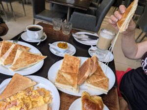 Pausat, our favorite coffee house, doesn’t open until 4:00pm on Saturdays, so we went to La Pasiva instead. They had a good breakfast deal: 860 pesos ($22.42) for two people, and included your choice of coffee (including espresso drinks), small glass of orange juice, scrambled eggs with ham, ham & cheese grilled cheese sandwiches, toast, and sweet croissants. After breakfast we went to a comic book shop, then picked up our fluffed and folded laundry.